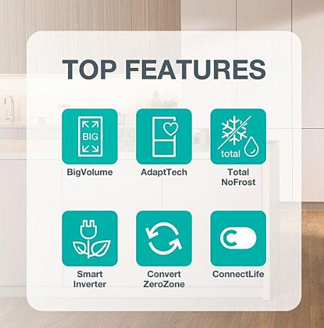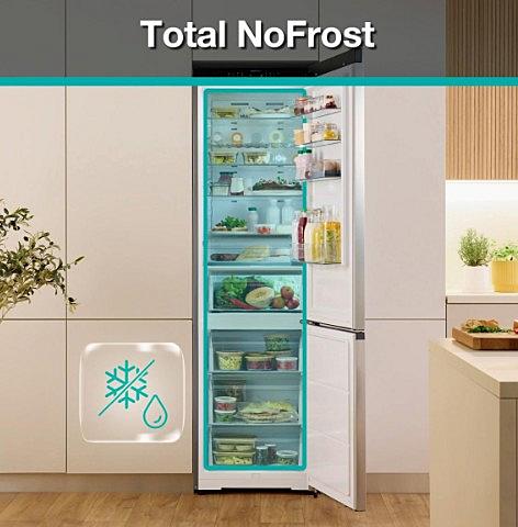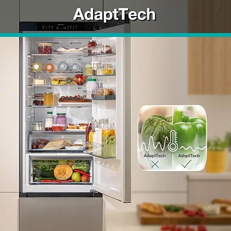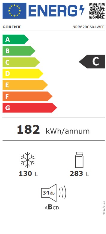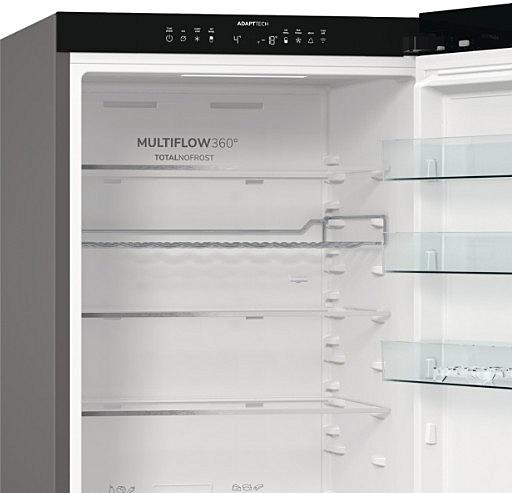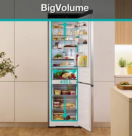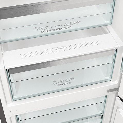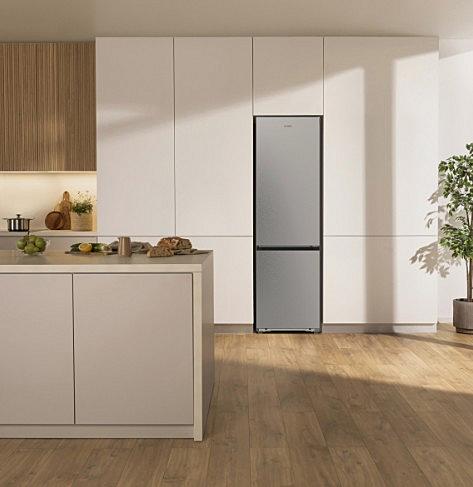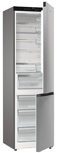 Beznámrazová kombinovaná lednice Gorenje s elektronickým ovládáním, funkcí super chlazení a mrazení a LED osvětlením. Celkový objem 413 l a energetická třída C.