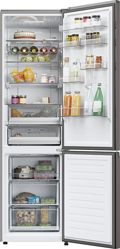 Beznámrazová kombinovaná lednice Haier s invertorovým kompresorem a zásuvkou se samostatnou regulací teploty. Energetická třída A, celkový objem 409 l a funkce rychlého chlazení a mrazení.
