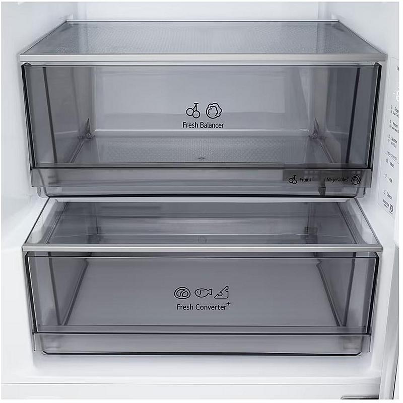 Smart beznámrazová kombinovaná lednice LG s funkcí super chlazení a mrazení a invertorovým kompresorem. Energetická třída C a zásuvka s regulací vlhkosti.