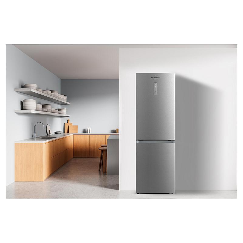 Beznámrazová kombinovaná lednice Philco s invertorovým kompresorem, funkcí dovolená a super chlazení a mrazení. Energetická třída C a celkový objem 338 l.