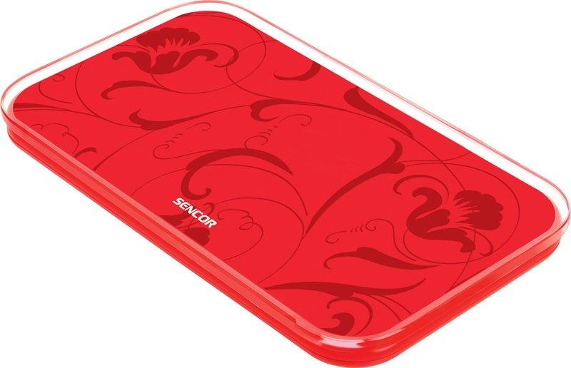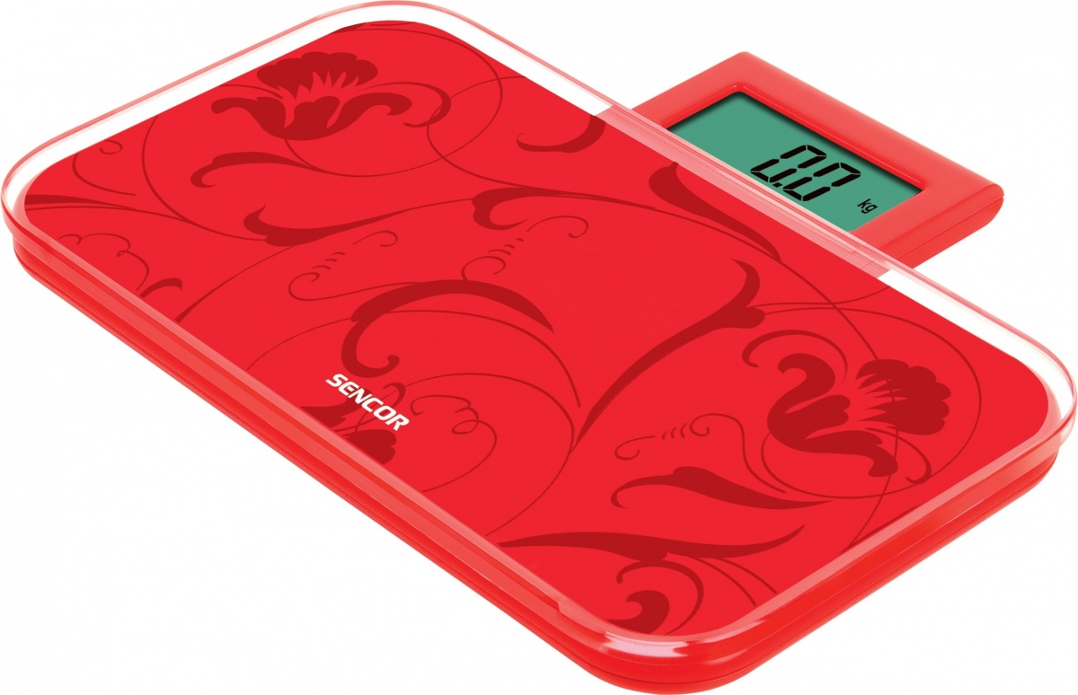 Tenká osobní váha Sencor v červeném designu šetří díky svým rozměrům místo v malých koupelnách. Je vhodná i pro cestování.