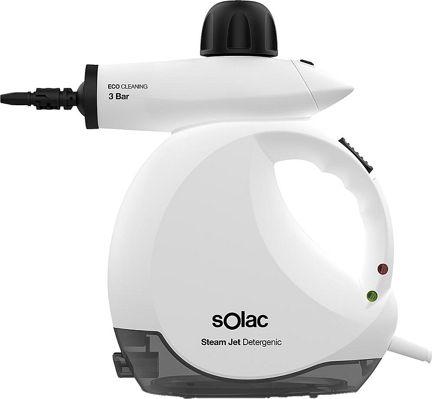 Parní čistič Solac s objemem nádrže 175 ml, příkonem 1200 W a průtokem páry 30 g/min.