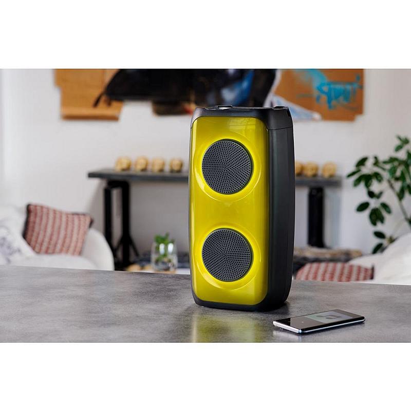 Bezdrátový party reproduktor Bigben s maximálním výkonem 50 W, dosahem až 10 m a RGB podsvícením.