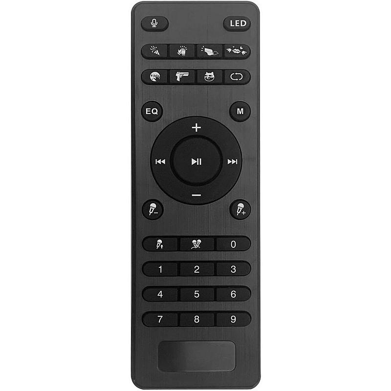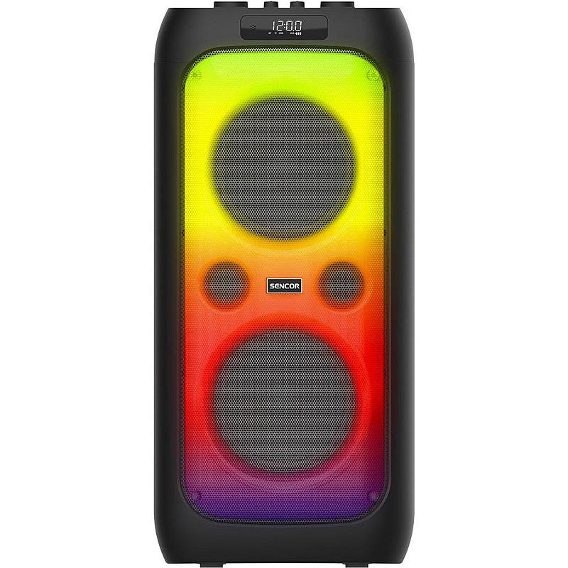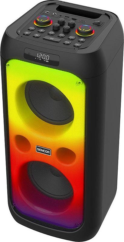 Bezdrátový audiosystém Sencor s mikrofonem, dálkovým ovládáním a LED barevným panelem s efekty. Výkon 100 W a dosah až 10 m.