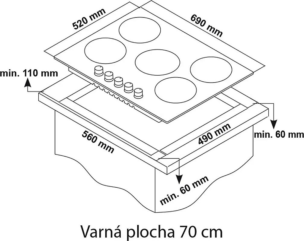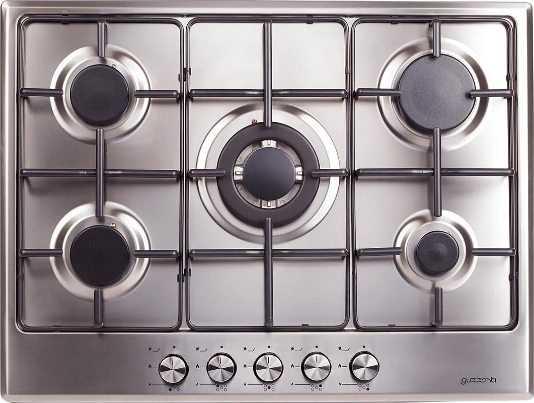 Plynová varná deska GUZZANTI s 5 hořáky. Integrované zapalování a bezpečnostní pojistka.
