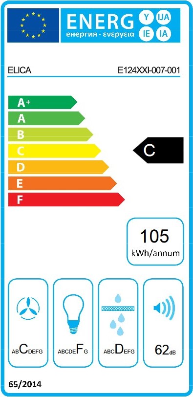 Podvěsná digestoř Elica se třemi rychlostmi a možností recirkulace. Maximální výkon 125 m3 za hodinu a halogenové osvětlení.