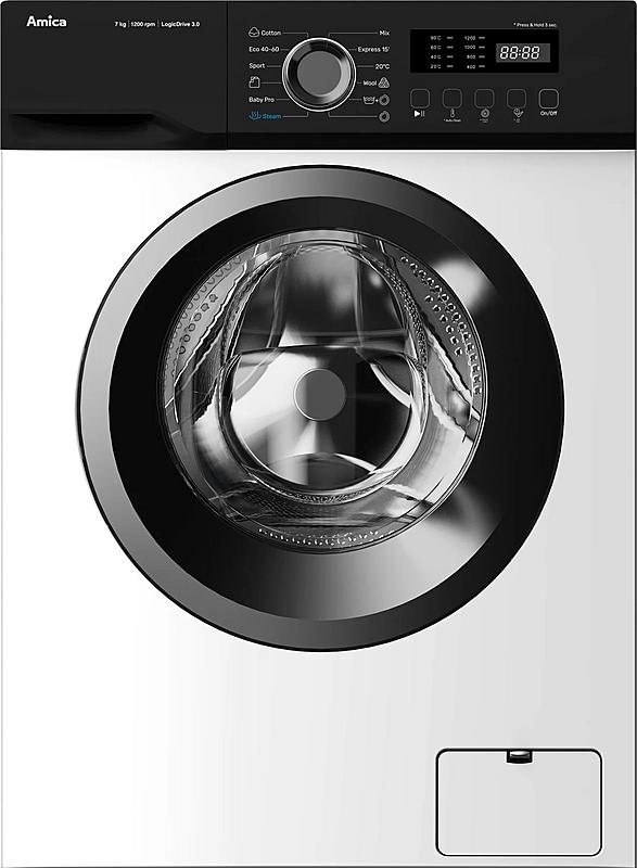 Předem plněná pračka Amica se snímačem zatížení a odloženým koncem. Energetická třída A, 12 programů a celková kapacita 7 kilogramů prádla.
