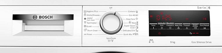 Předem plněná pračka Bosch s ukazatelem zbytkového času, LED displejem a kapacitou 9 kg prádla. Energetická třída A a dětská pojistka.