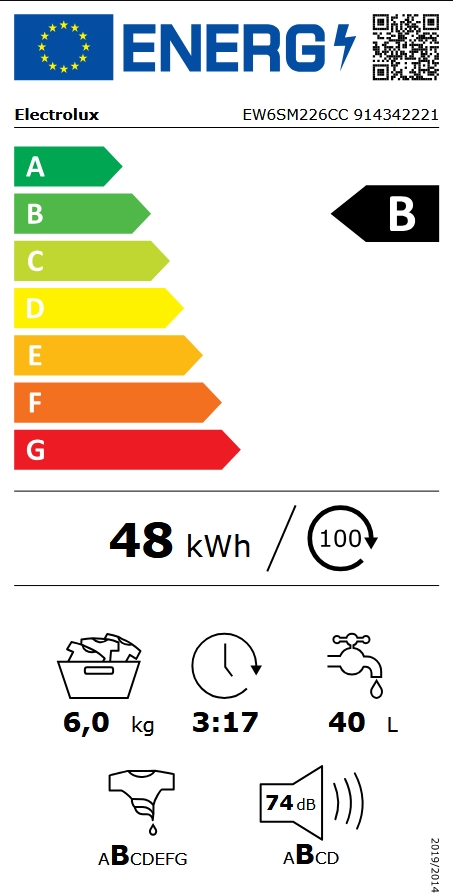 Úzká předem plněná pračka Electrolux s funkcí páry a odloženým startem. Energetická třída B, 14 programů a celková kapacita 6 kilogramů prádla.
