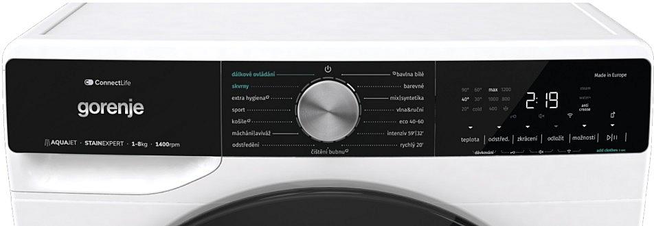 Předem plněná pračka Gorenje s invertorovým motorem, možností ovládání přes WiFi a parní funkcí. Energetická třída A, kapacita 8 kg prádla a hloubka pouze 46,5 cm.