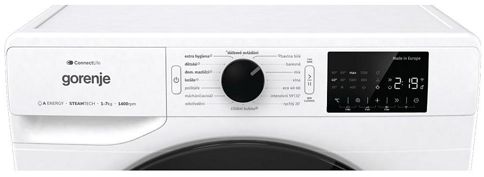 Předem plněná pračka Gorenje s invertorovým motorem, parní funkcí a 15 programy. Kapacita 7 kg prádla, energetická třída A a možnost ovládání přes aplikaci.
