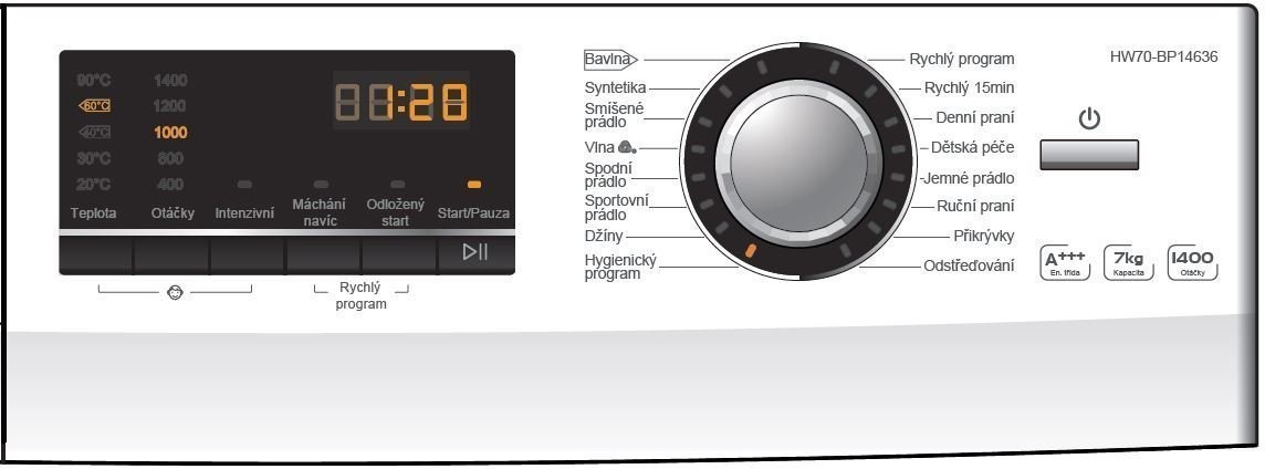 Pračka Haier s LED displejem a funkcí odloženého startu. Energetická třída A+++, 16 pracích programů a celková kapacita 7 kilogramů prádla.