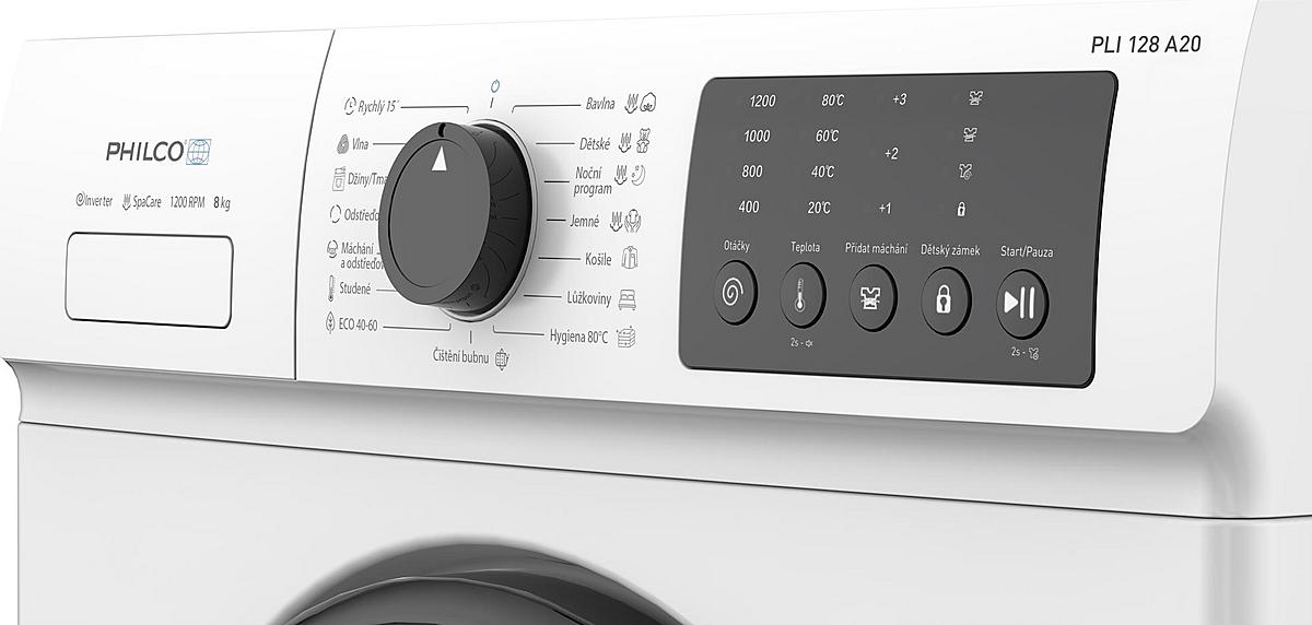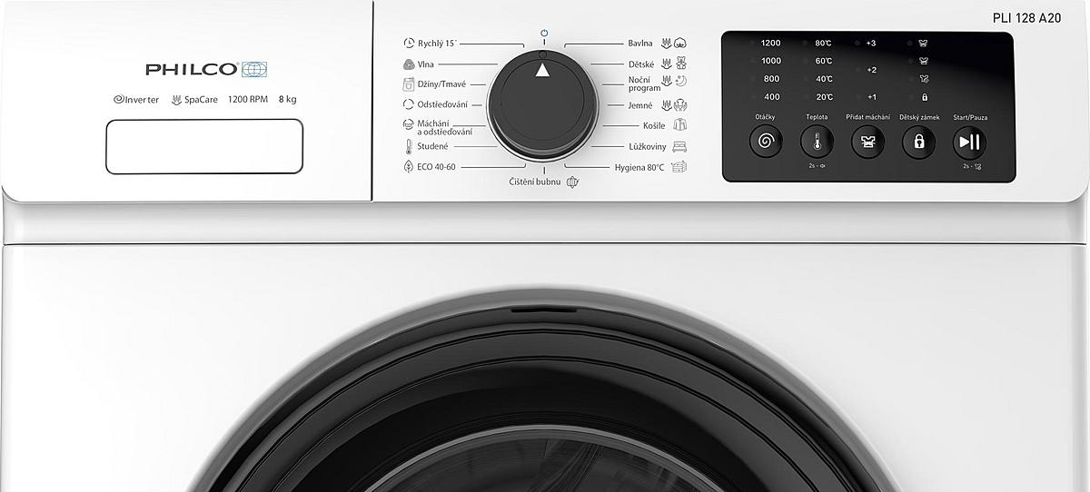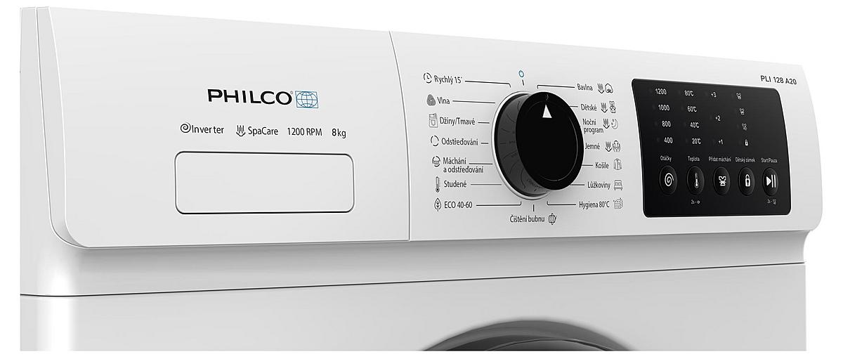 Předem plněná pračka Philco s invertorovým motorem, množstevní automatikou a parním programem. Energetická třída A, kapacita 8 kg prádla a 15 programů.