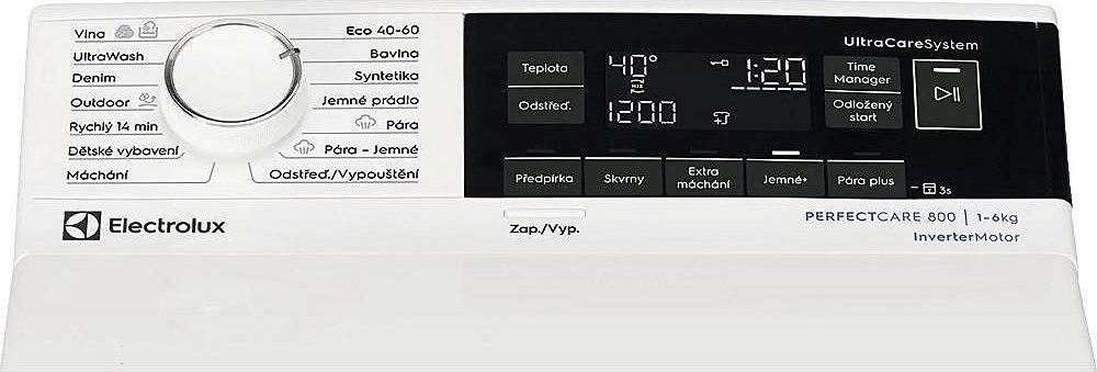 Vrchem plněná pračka Electrolux s parní funkcí, funkcí Eco TimeManager pro úsporu energie a rychlým programem. Energetická třída A a kapacita 6 kg prádla.