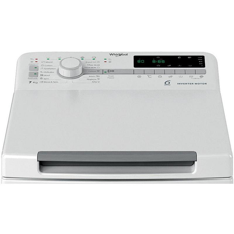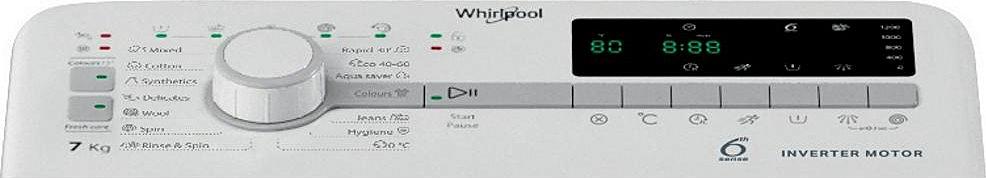 Pračka s vrchním plněním Whirlpool s odloženým startem, regulací teploty a Eco programem. Energetická třída B a kapacita 7 kg prádla.