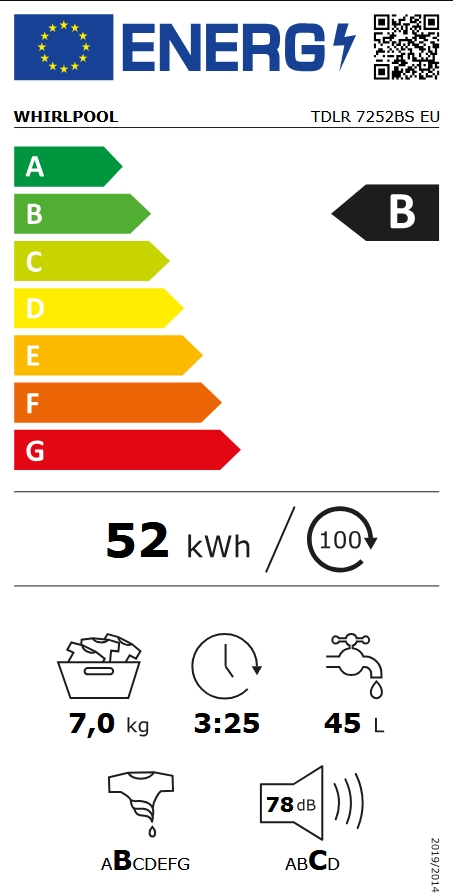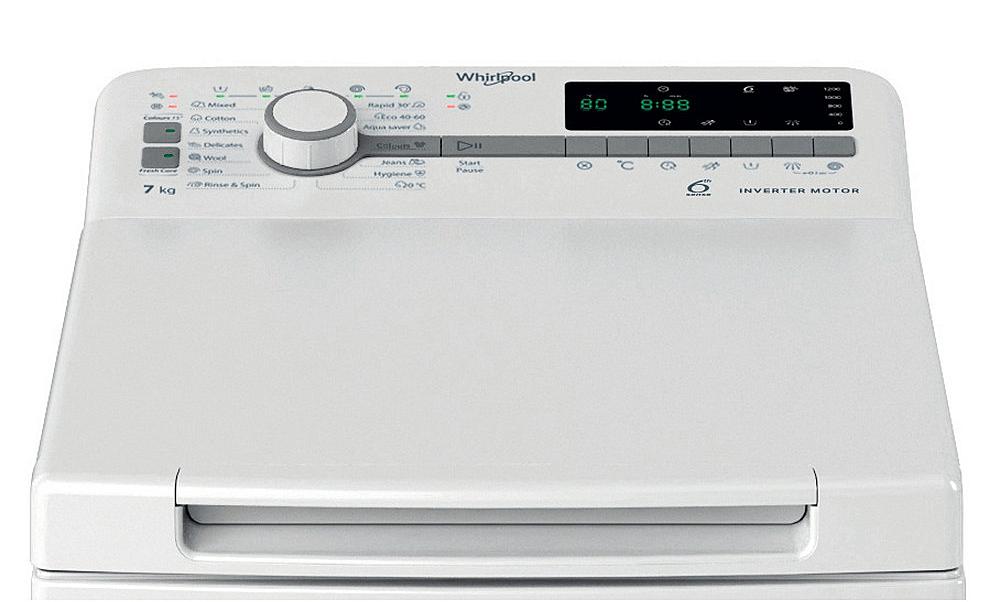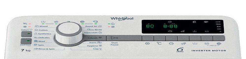 Vrchem plněná pračka Whirlpool s technologií 6. smyslu a dětským zámkem. Energetická třída B, odložený start a celková kapacita 7 kilogramů prádla.