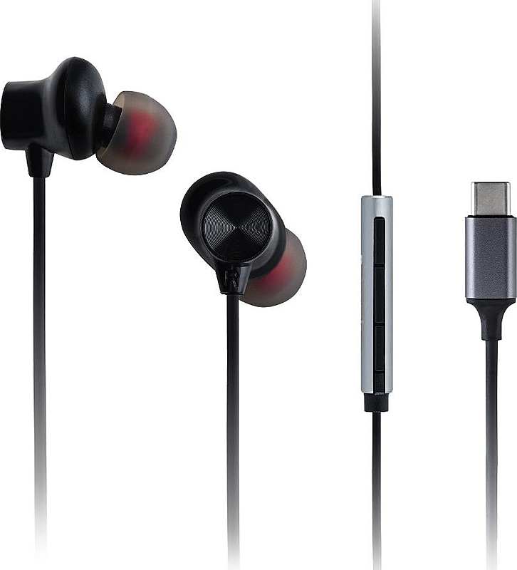 Sluchátka Panasonic s USB-C kabelem, integrovaným mikrofonem a výměnnými nástavci.