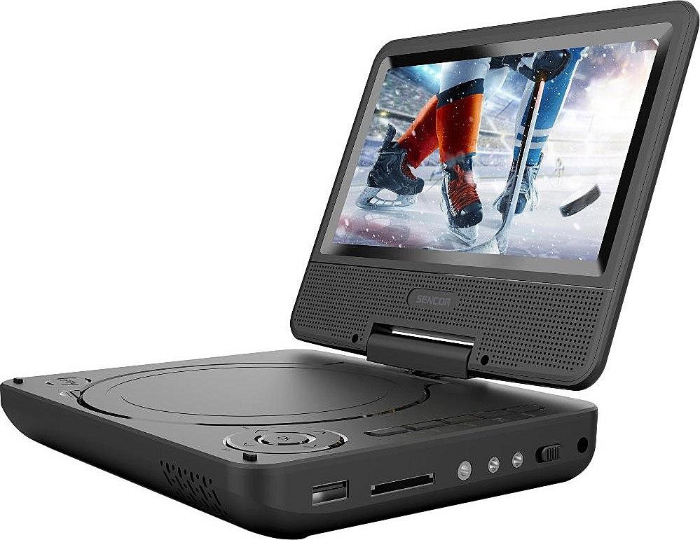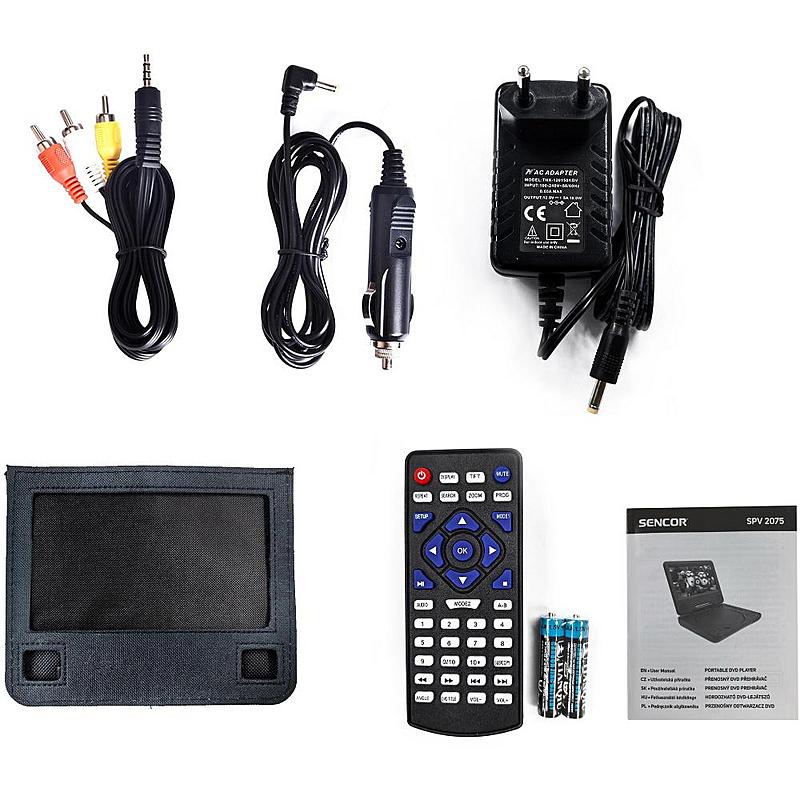 Přenosný DVD přehrávač Sencor s nabíječkou do auta, elektronickou ochranou proti přeskakování a 7palcovým otočným LCD displejem.