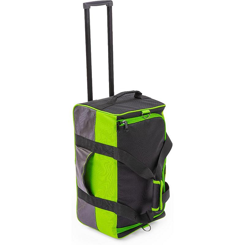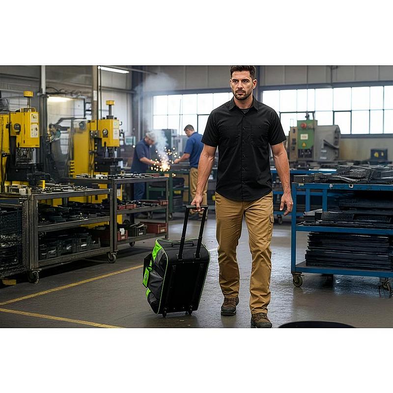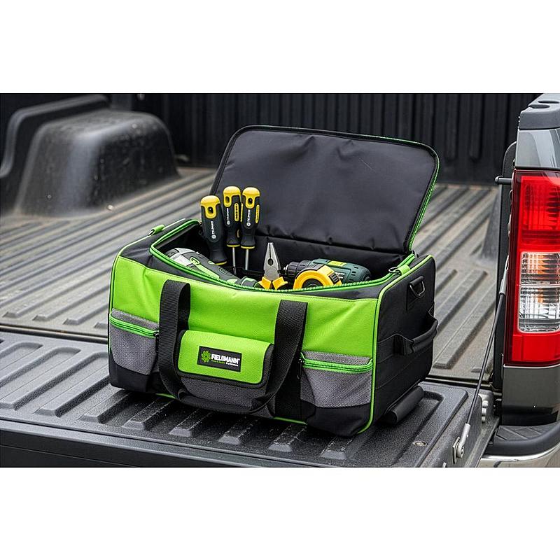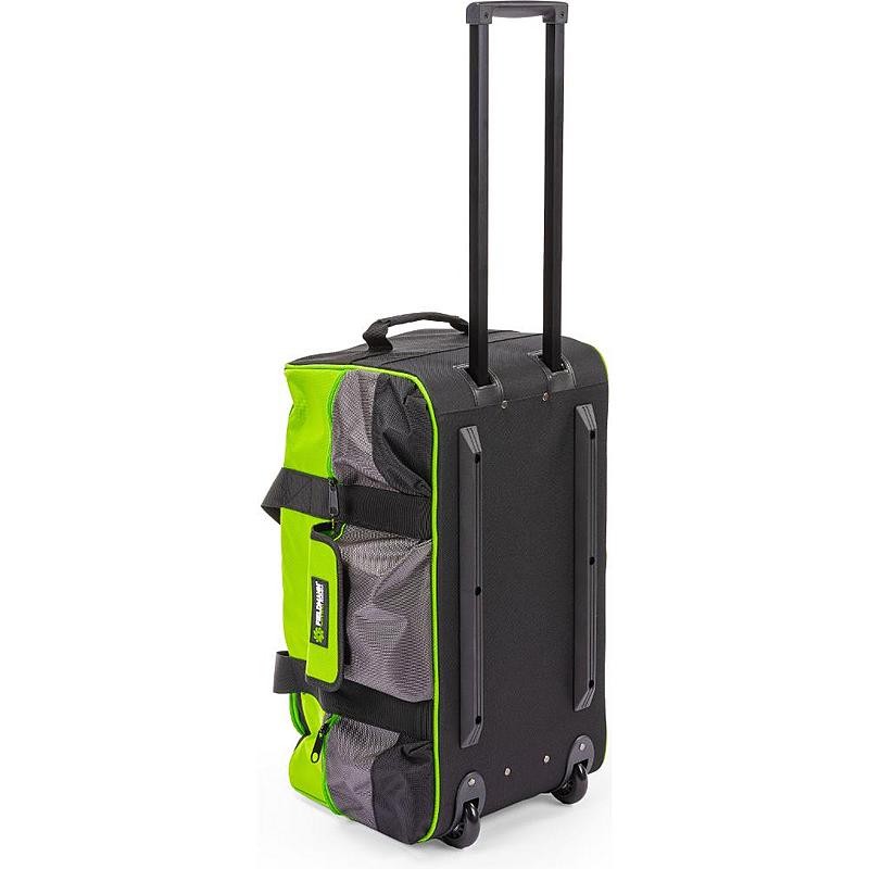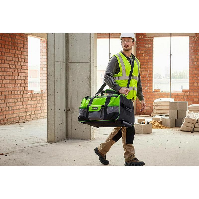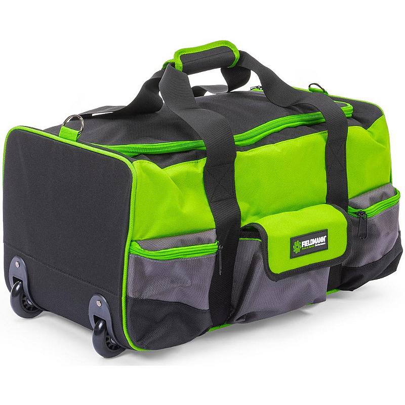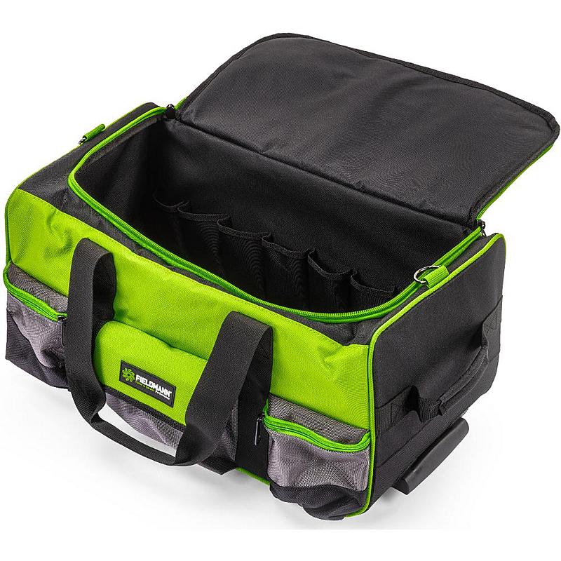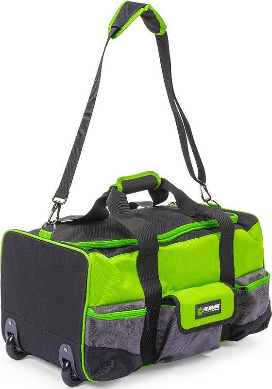 Brašna na nářadí Fieldmann s pevným tvrdým dnem, polstrovaným ramenním popruhem, teleskopickou tyčí s rukojetí a kolečky.