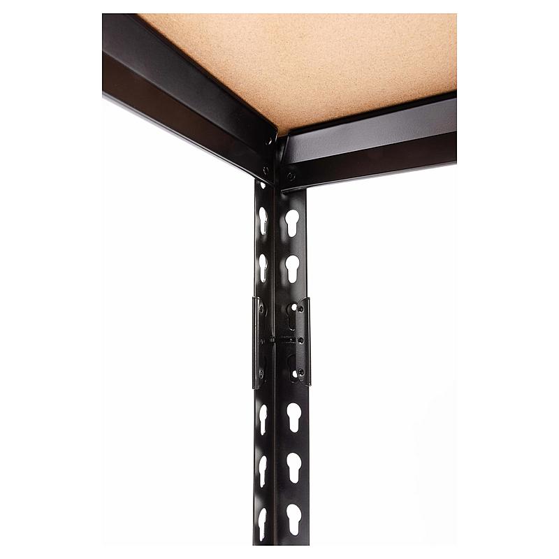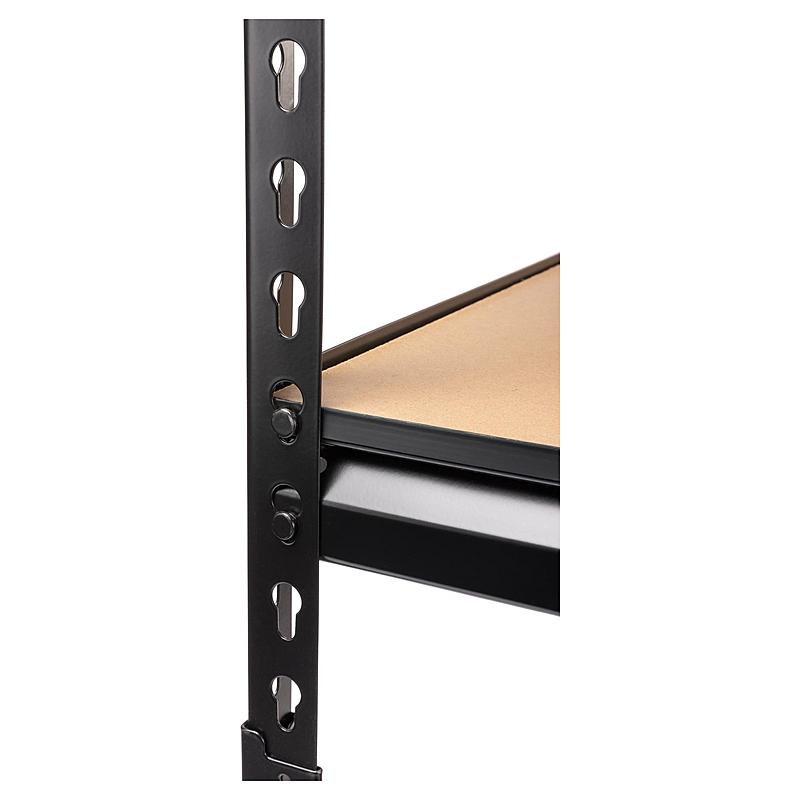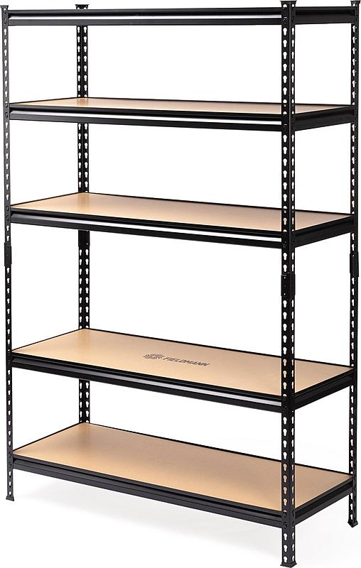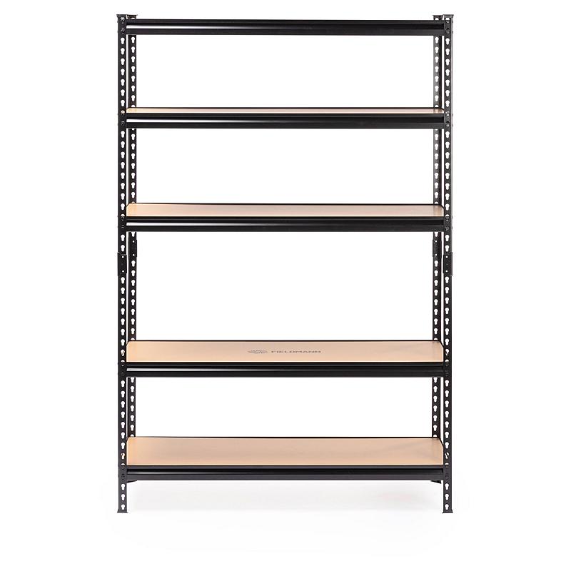 Kovový regál Fieldmann s pěti policemi a MDF deskami o tloušťce 5 mm.