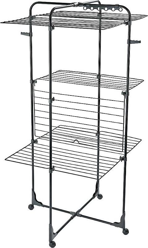 Sušák na prádlo Leifheit se třemi patry a integrovanými kolečky.