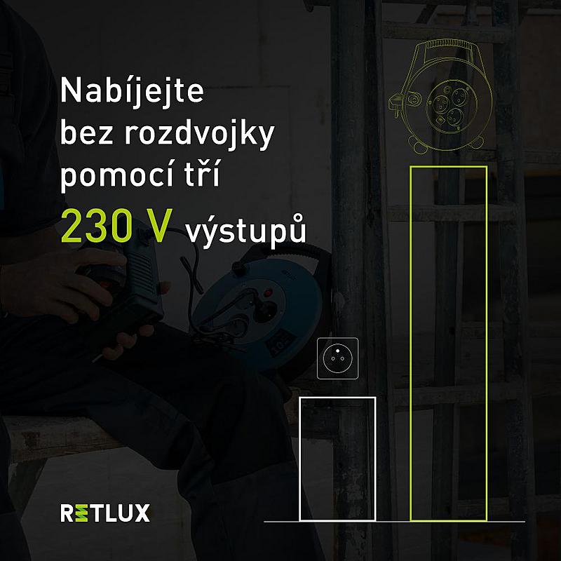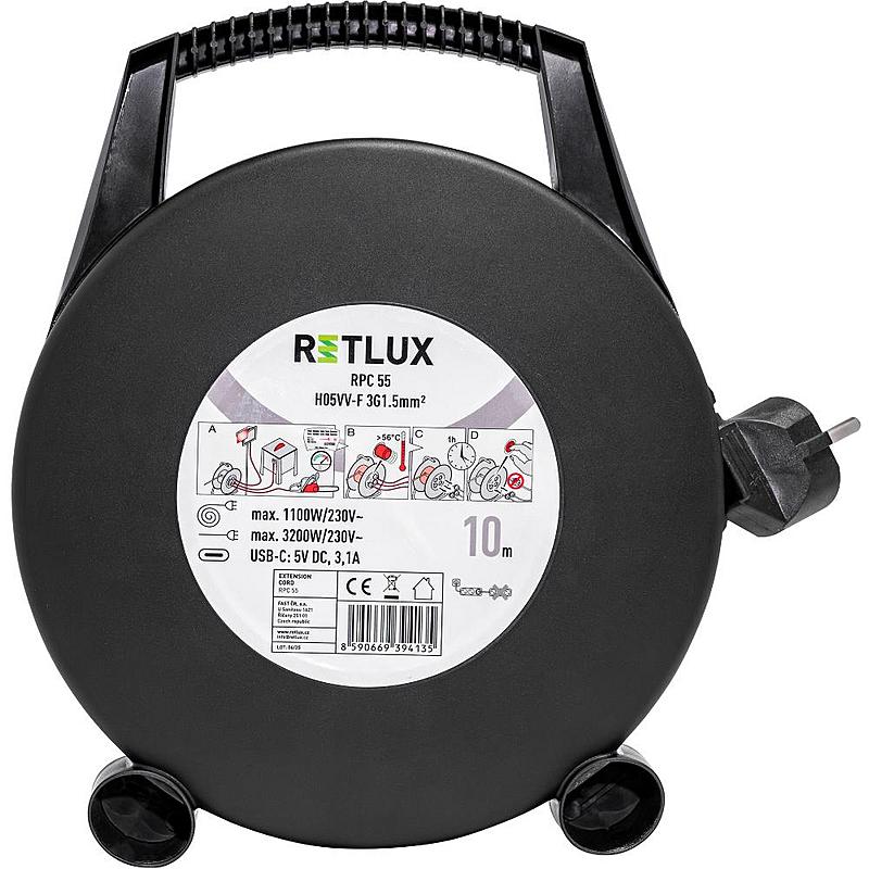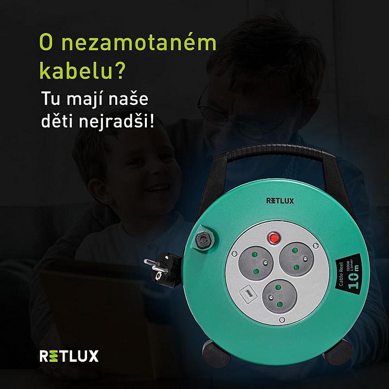 Prodlužovací přívod s navíjecím bubnem Retlux se třemi zásuvkami a jedním USB-C konektorem.