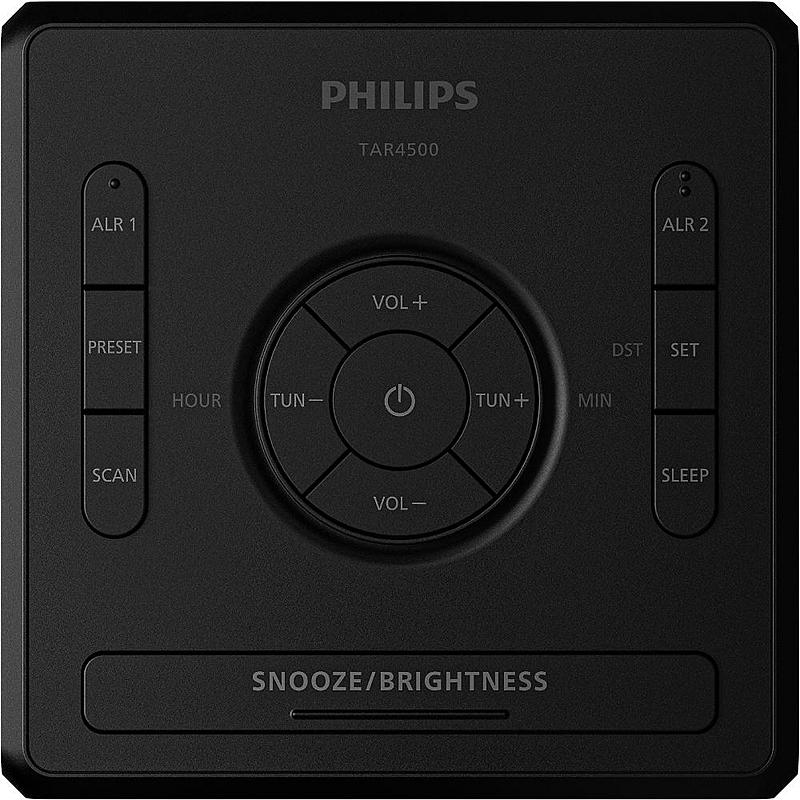 Radiobudík Philips s ovládáním jasu, FM tunerem a funkcí opakovaného buzení.