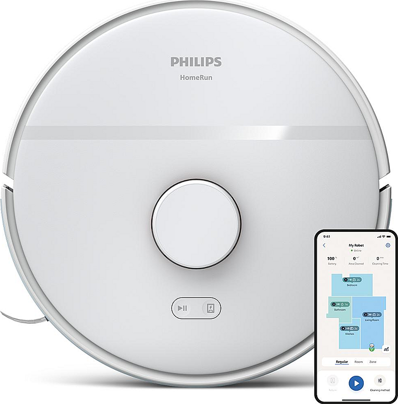Robotický vysavač Philips s funkcí mopu, dobou provozu až 120 minut a ovládáním přes mobilní aplikaci.
