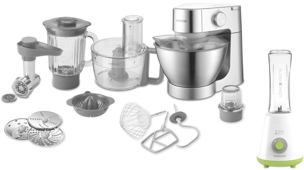 Sada Kenwood obsahující kuchyňský robot s příkonem 900 wattů, třemi metlami, plynule nastavitelnou rychlostí a stolní mixér se dvěma nádobami o objemu 0,6 litru a pulsním spínačem.