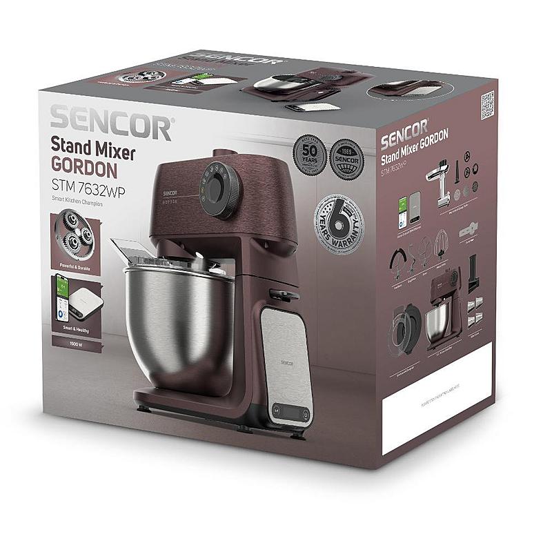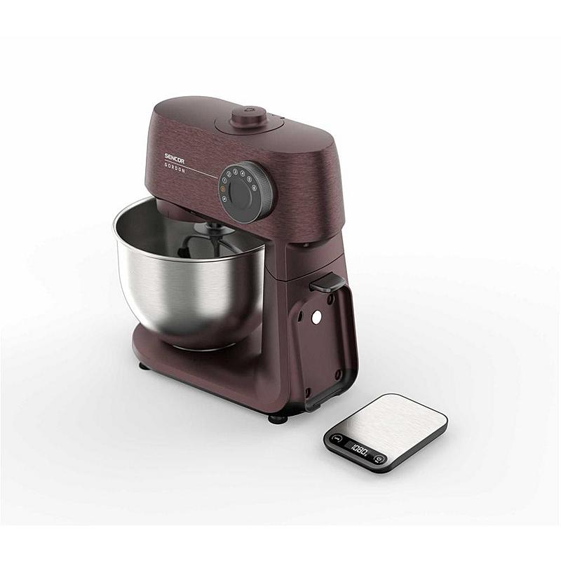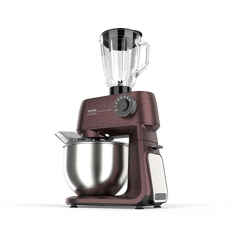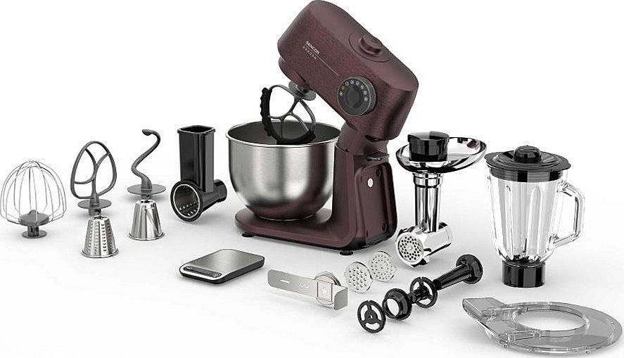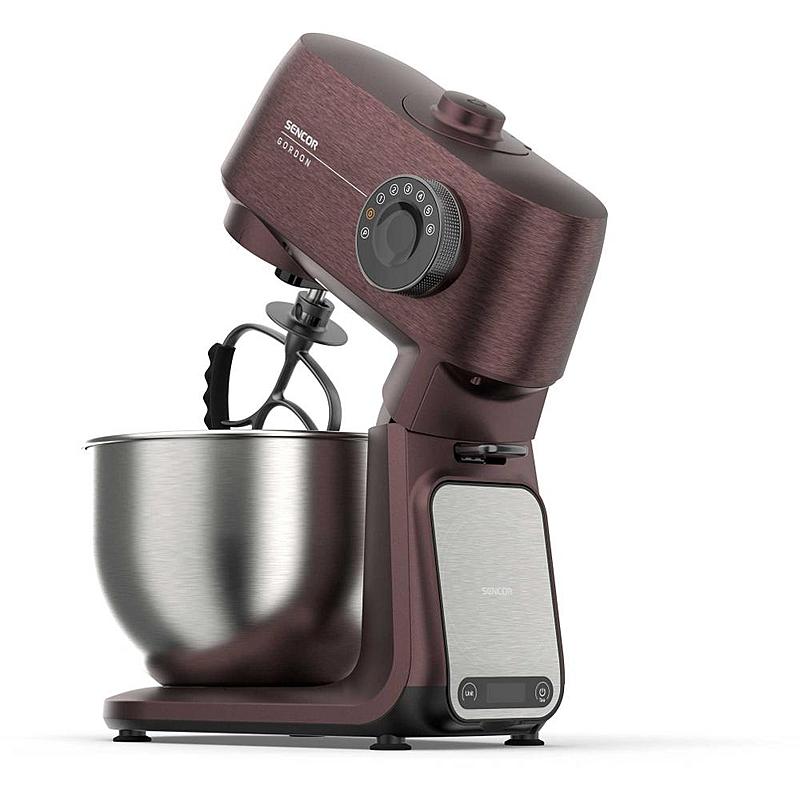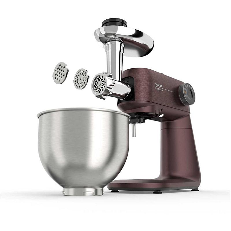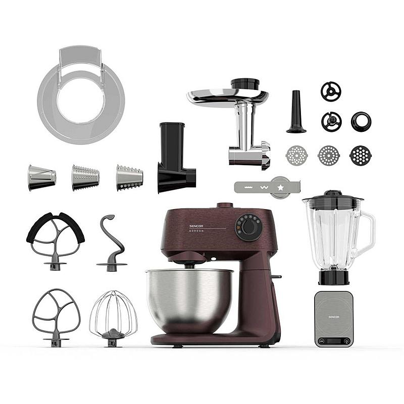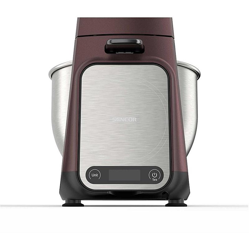 Kuchyňský robot Sencor s robustním celokovovým tělem s kovovými převody, výkonným 1500W motorem, odnímatelnou váhou a LED osvětlením míchací nádoby.