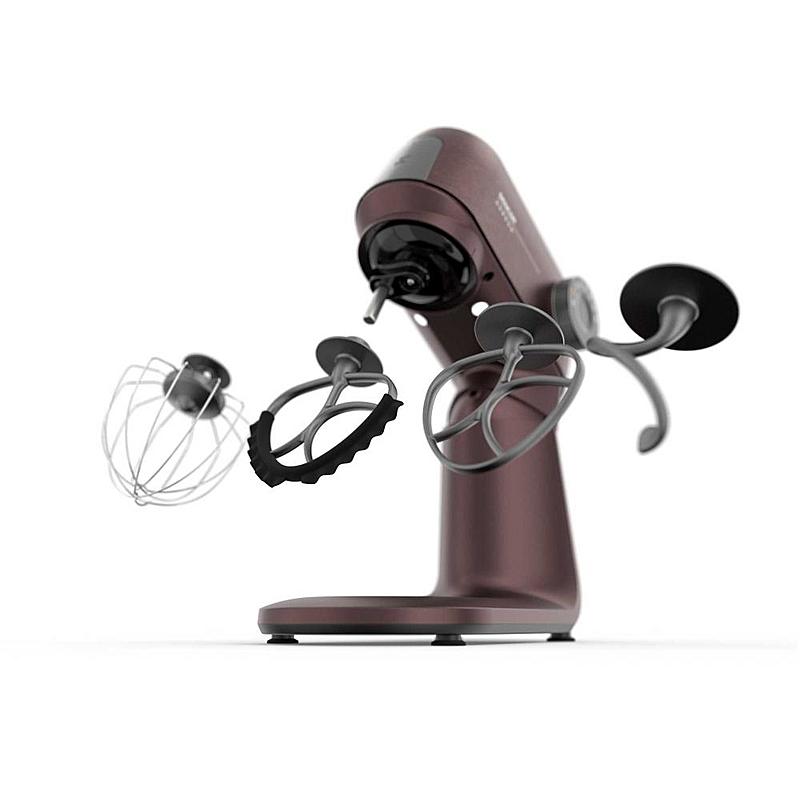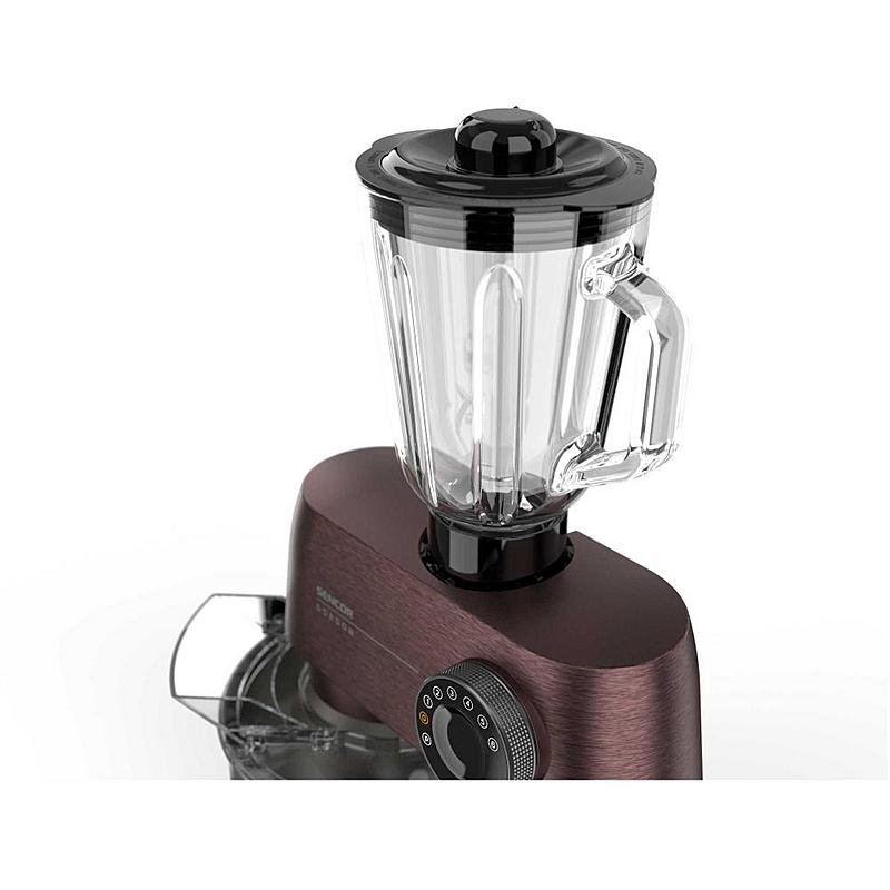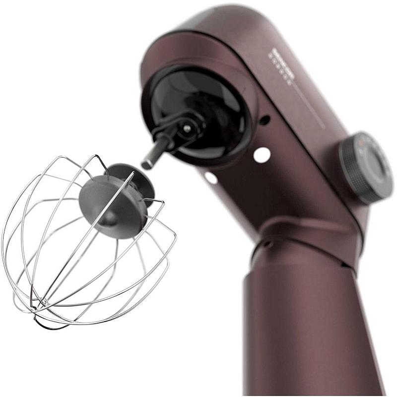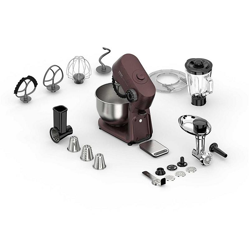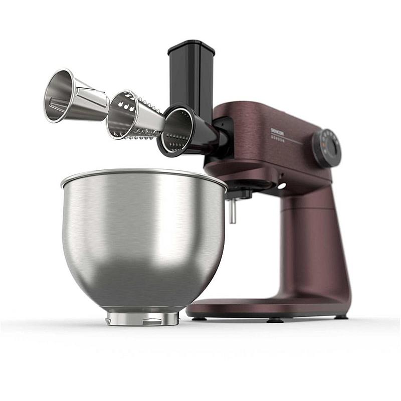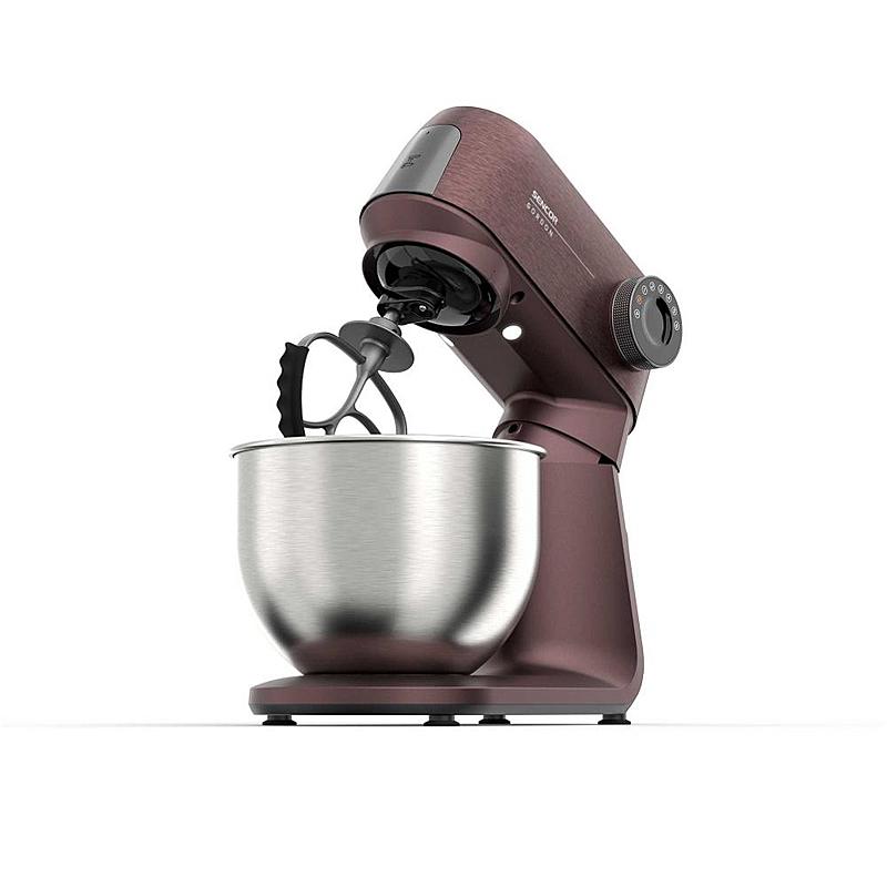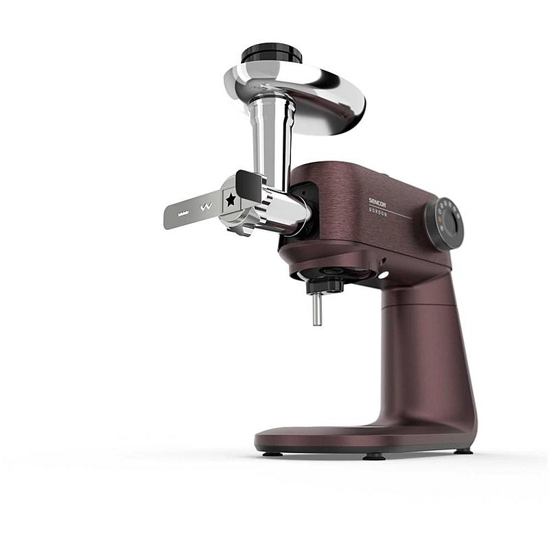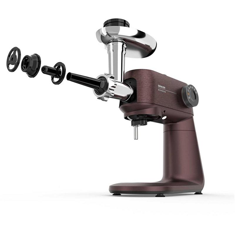 Kuchyňský robot Sencor s robustním celokovovým tělem s kovovými převody, výkonným 1500W motorem, odnímatelnou váhou a LED osvětlením míchací nádoby.