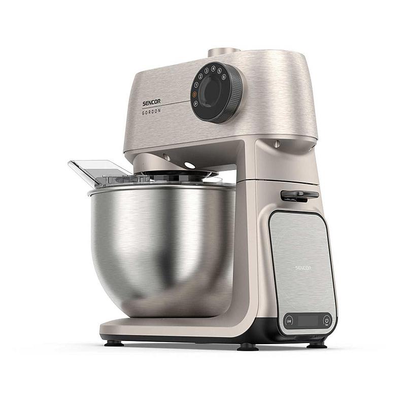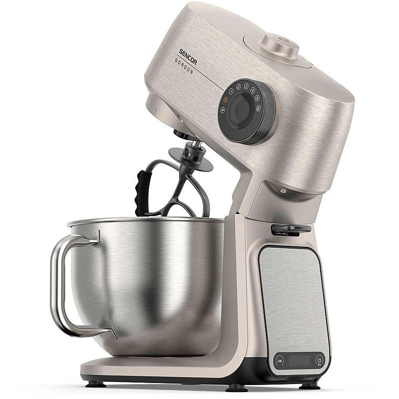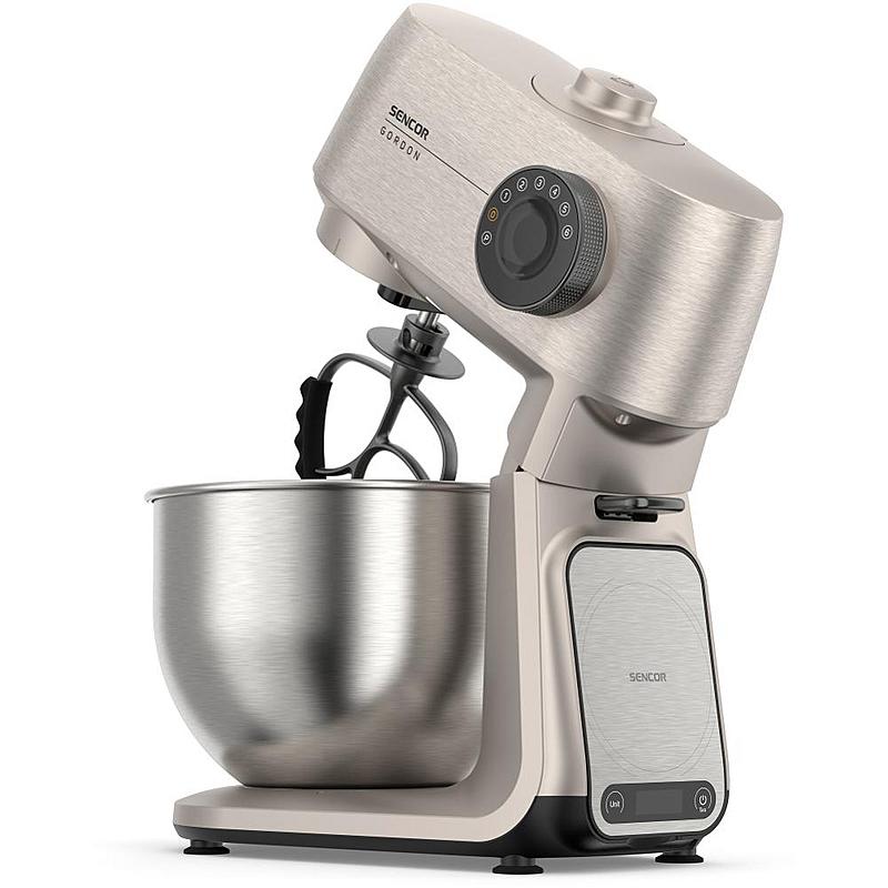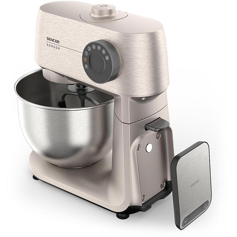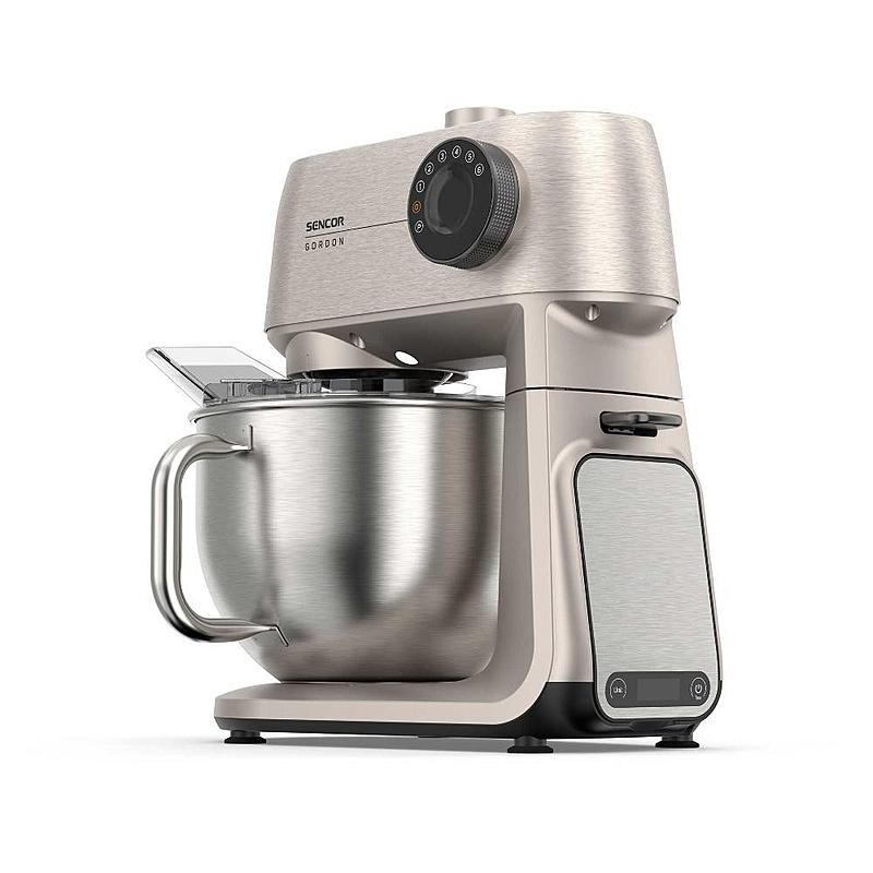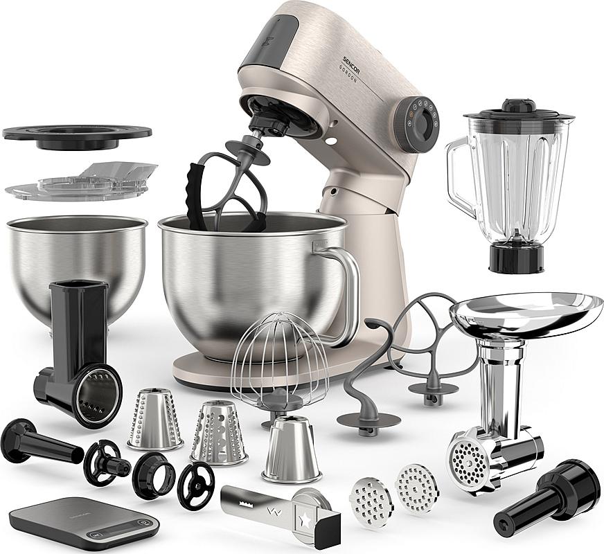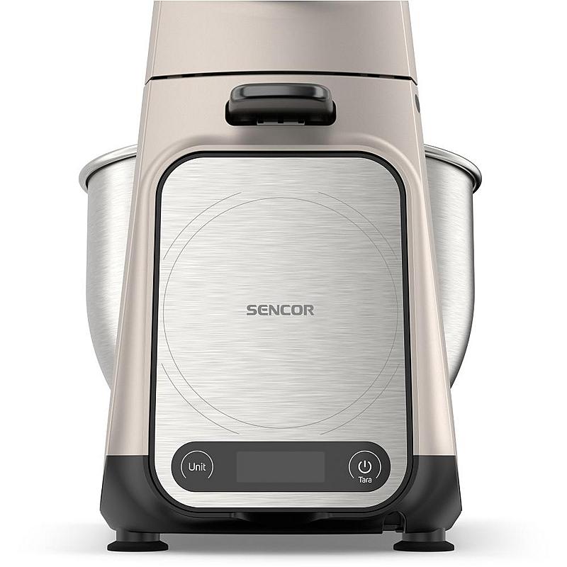 Kuchyňský robot Sencor s výkonem 1500 W, robustním celokovovým tělem a planetární převodovkou. Odnímatelná chytrá váha s aplikací a dvě hnětací mísy.