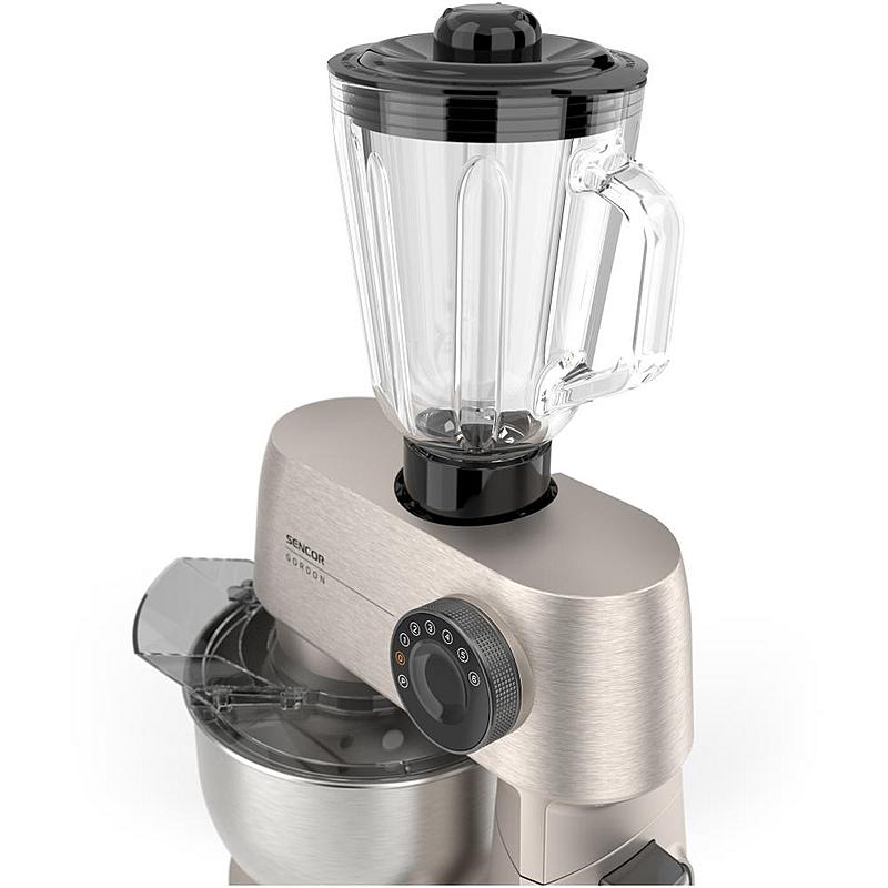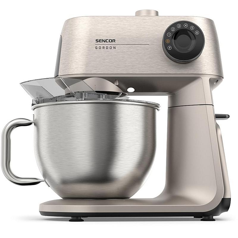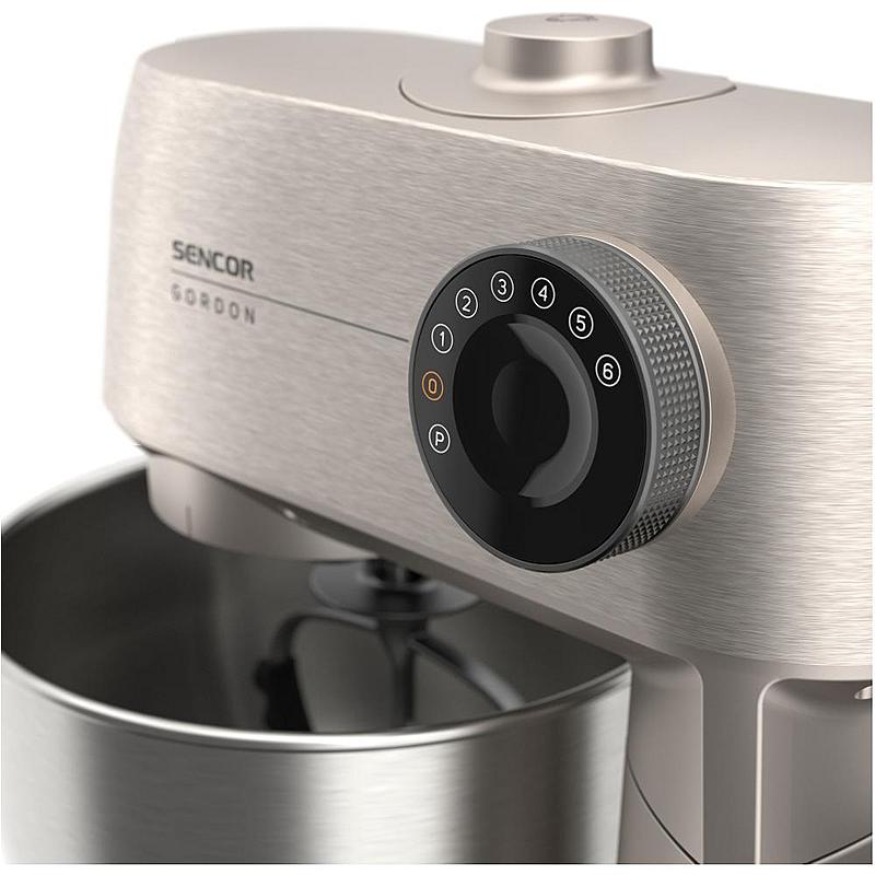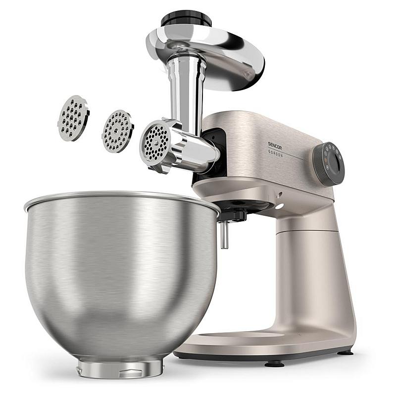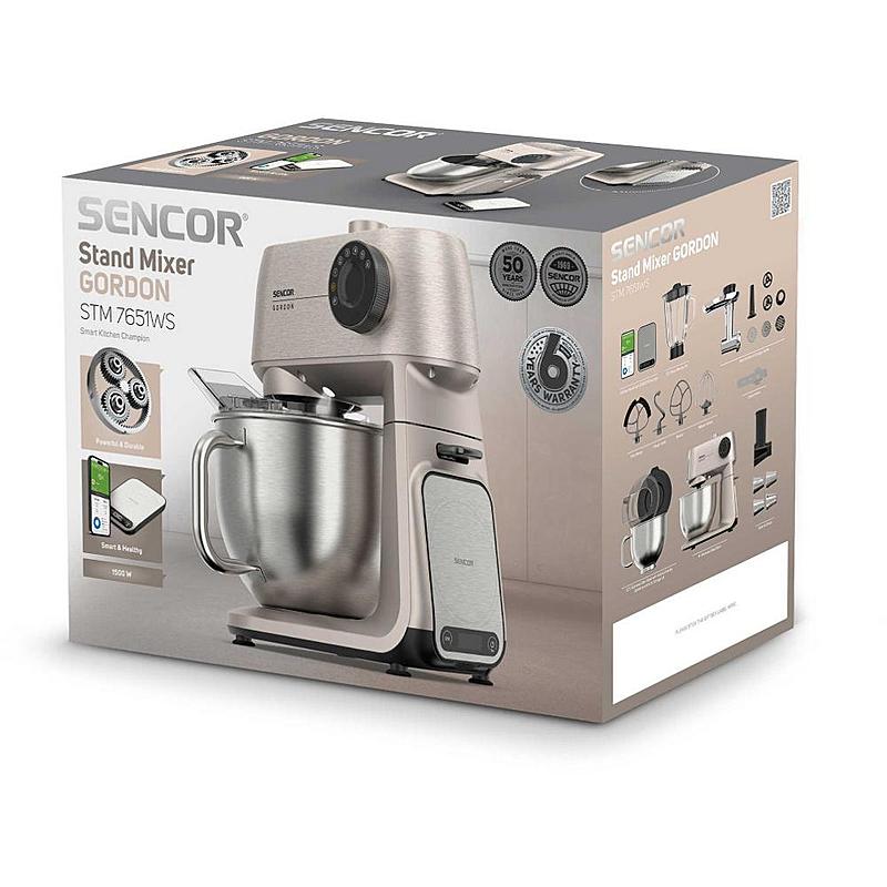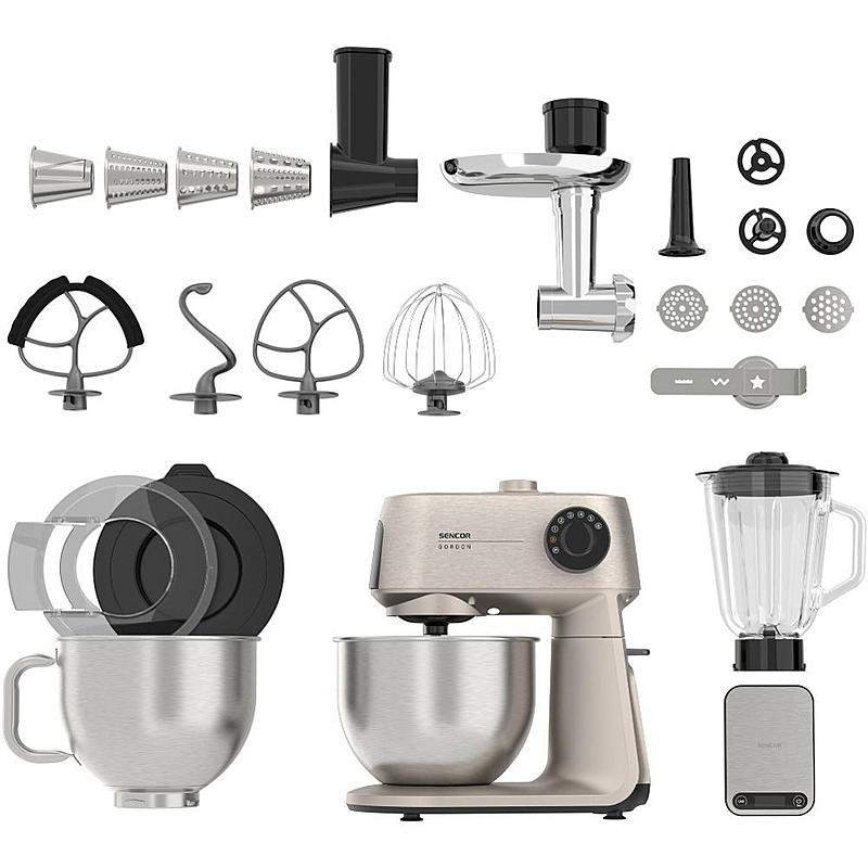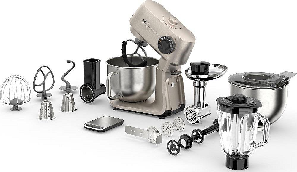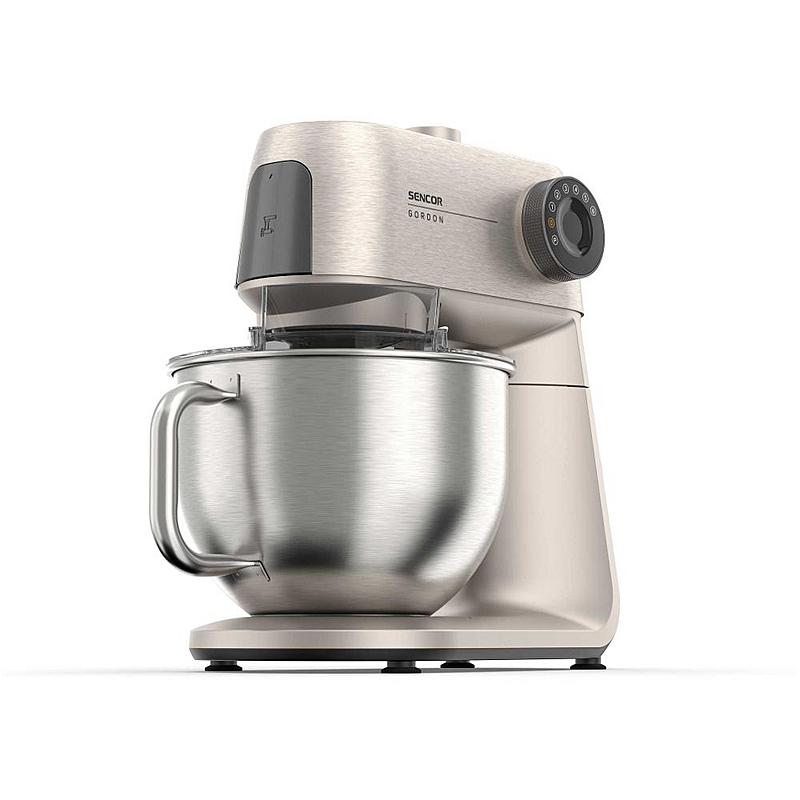 Kuchyňský robot Sencor s výkonem 1500 W, robustním celokovovým tělem a planetární převodovkou. Odnímatelná chytrá váha s aplikací a dvě hnětací mísy.