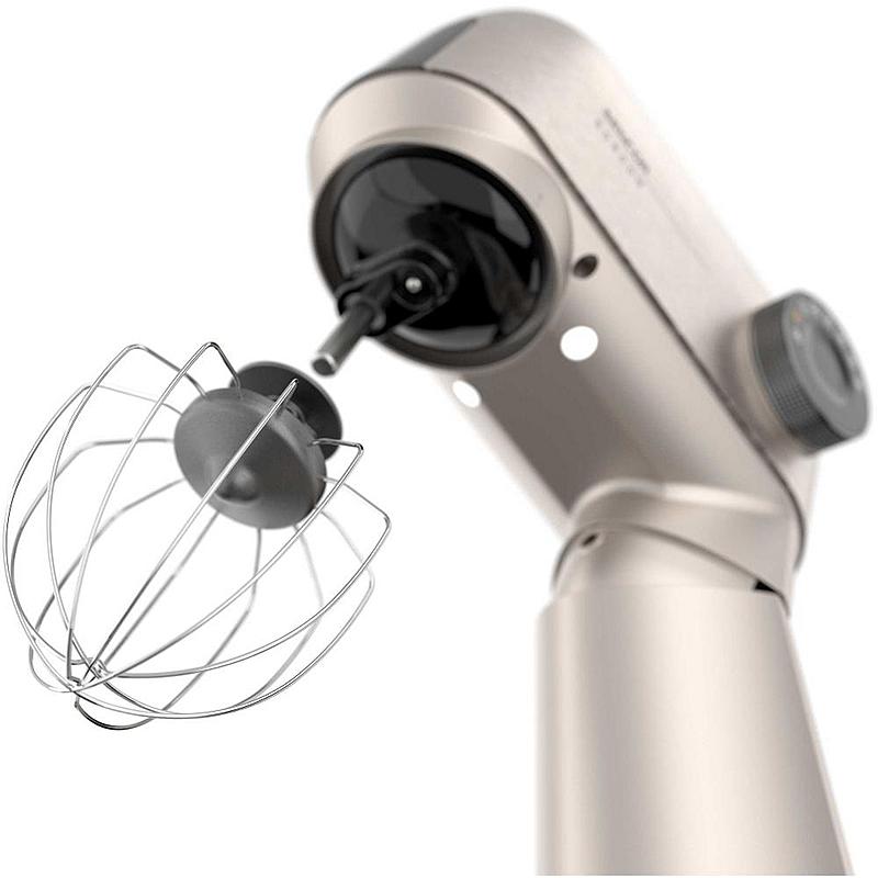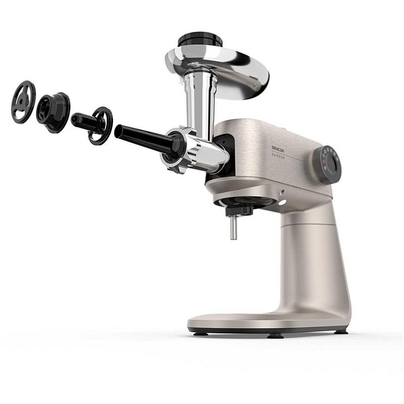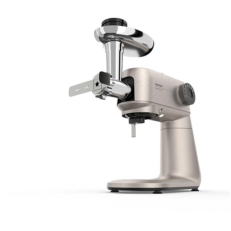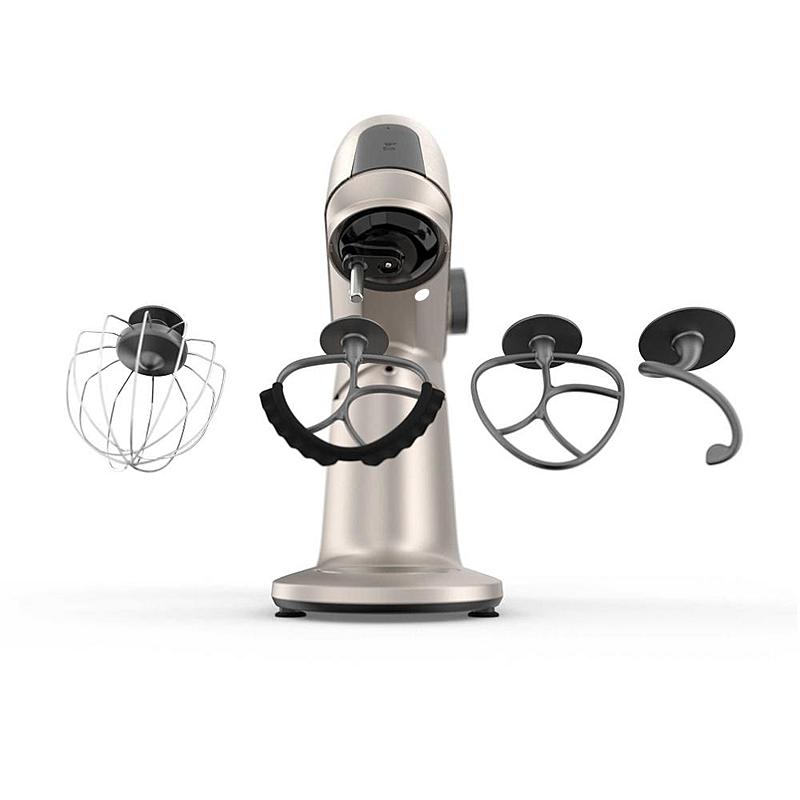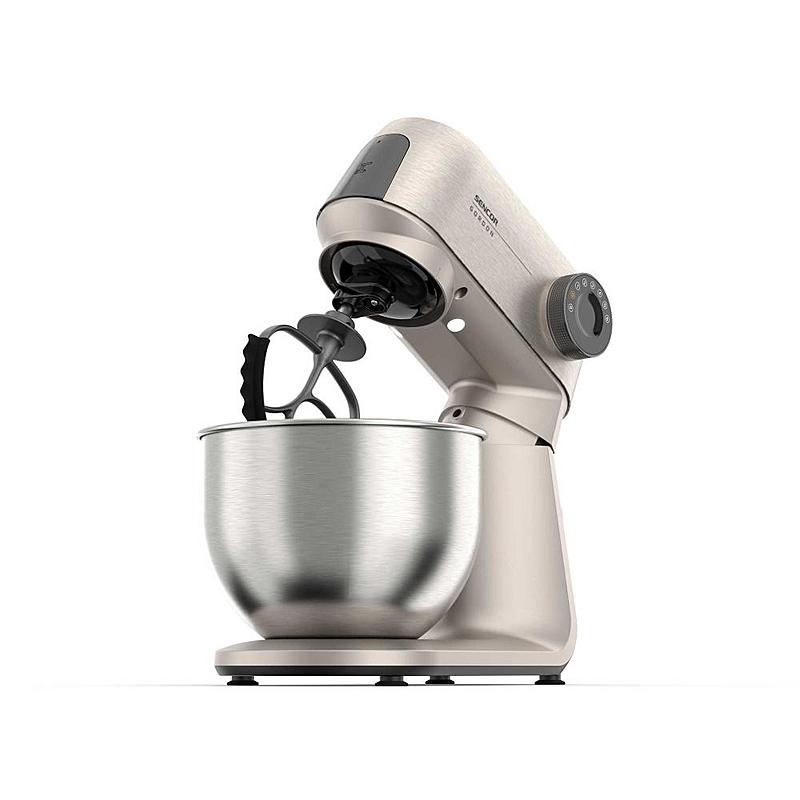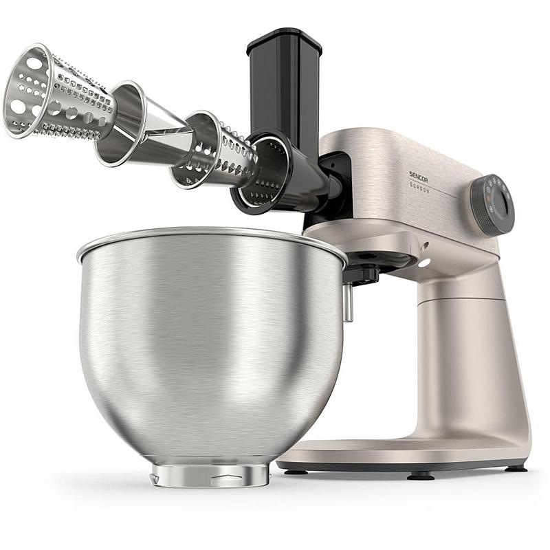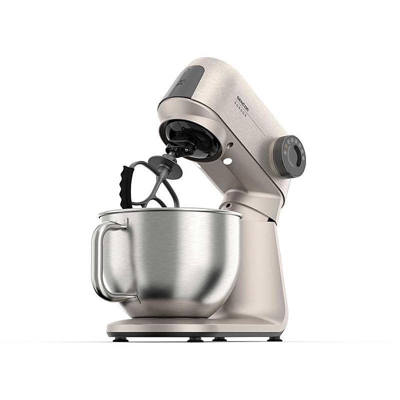 Kuchyňský robot Sencor s výkonem 1500 W, robustním celokovovým tělem a planetární převodovkou. Odnímatelná chytrá váha s aplikací a dvě hnětací mísy.