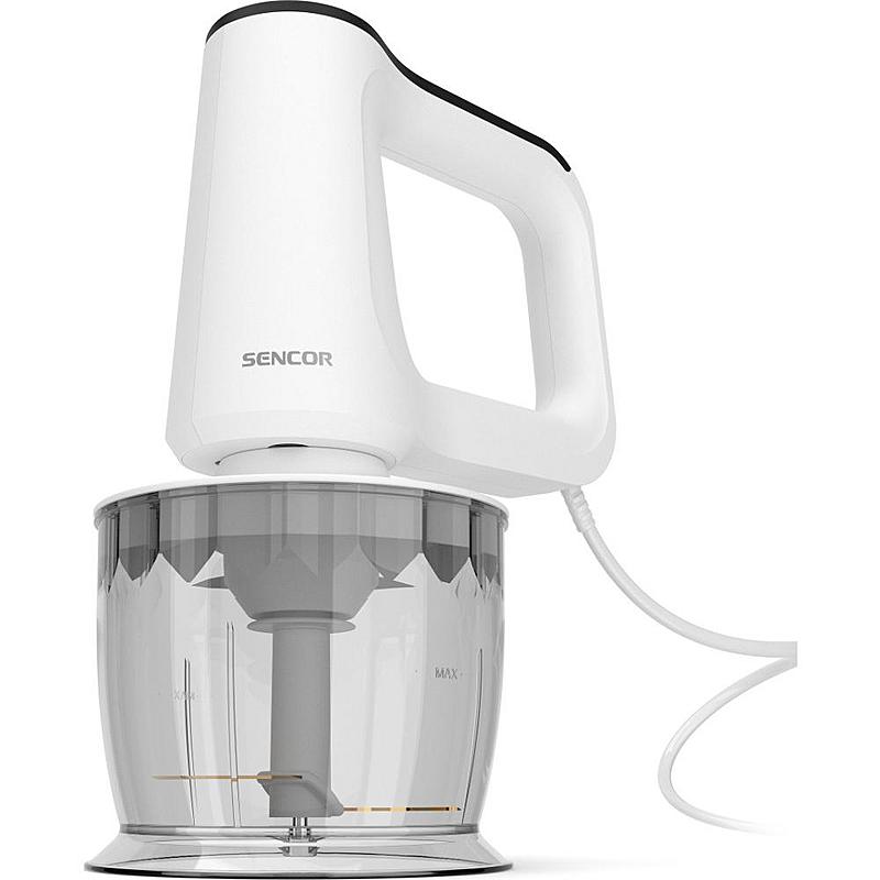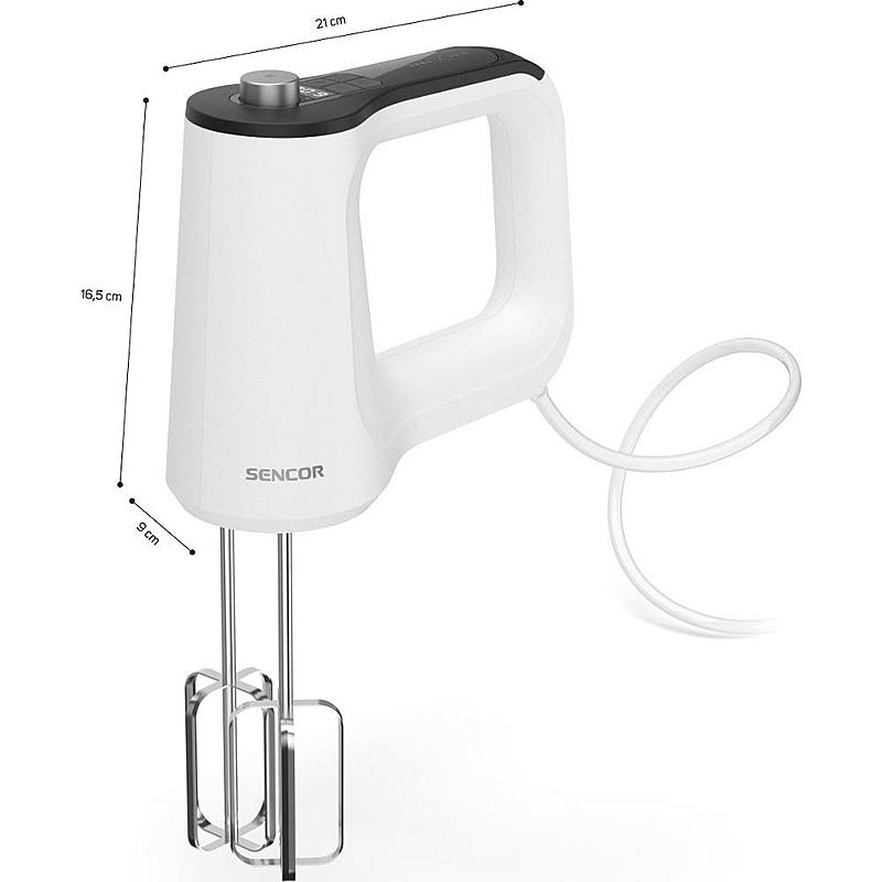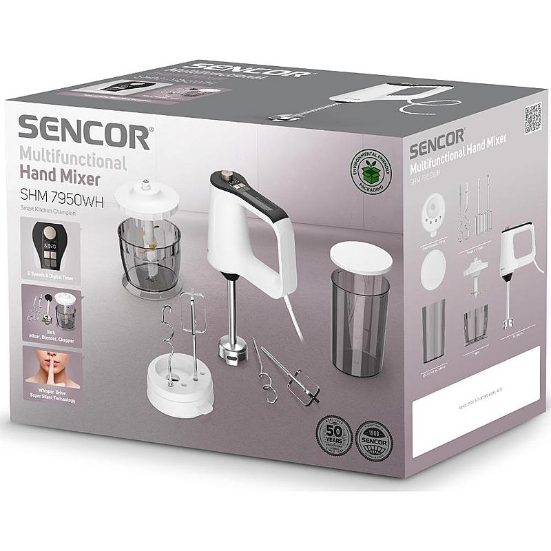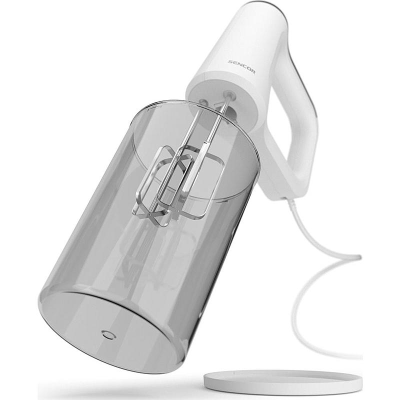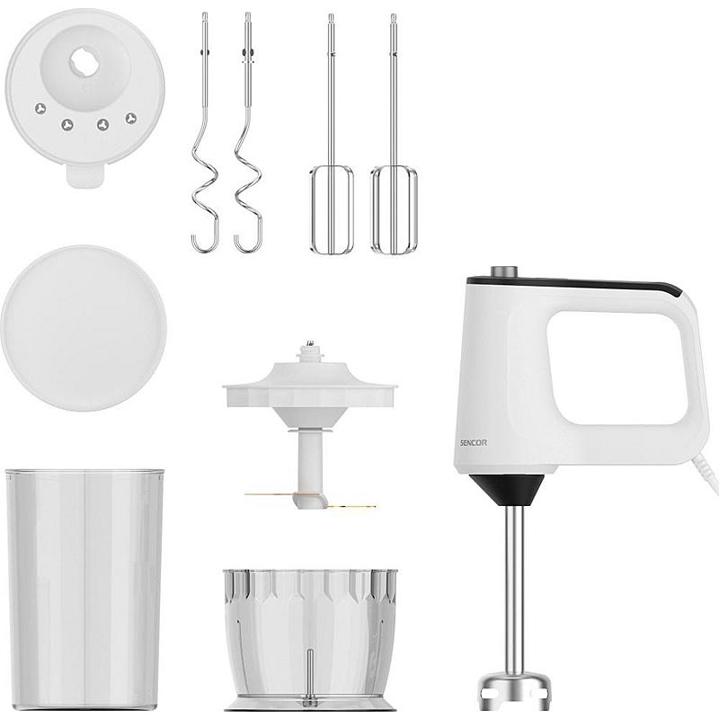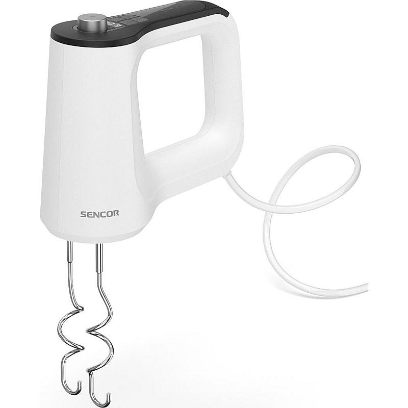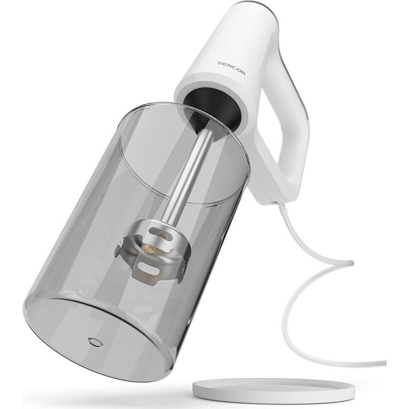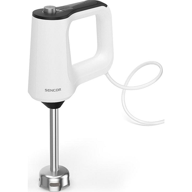 Multifunkční ruční šlehač Sencor s LED displejem, výkonným DC motorem a stojánkem na příslušenství.