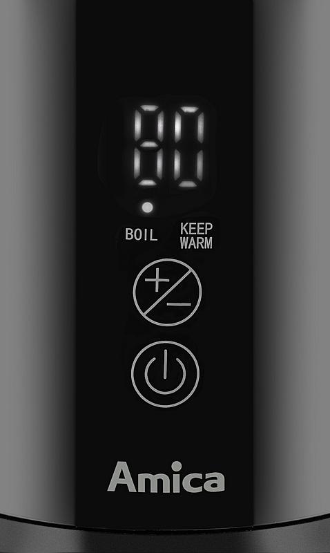 Rychlovarná konvice Amica s objemem 1,5 l, funkcí regulace a udržování teploty a ukazatelem hladiny vody uvnitř konvice. LED displej a dotykový panel.