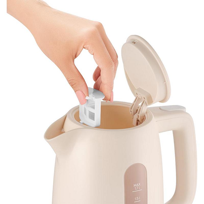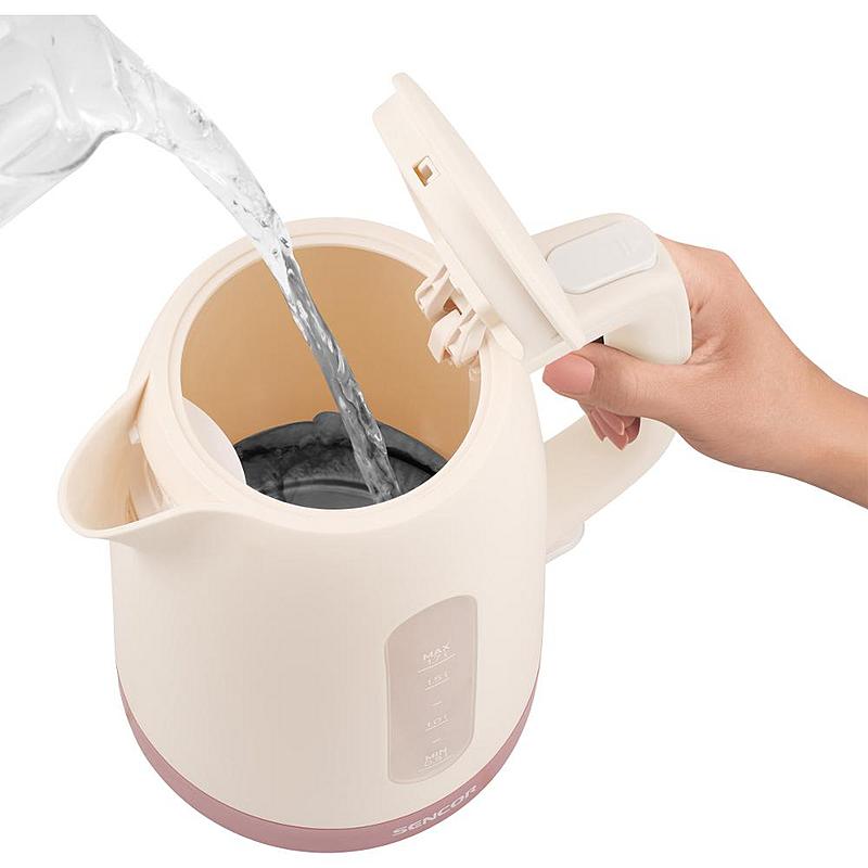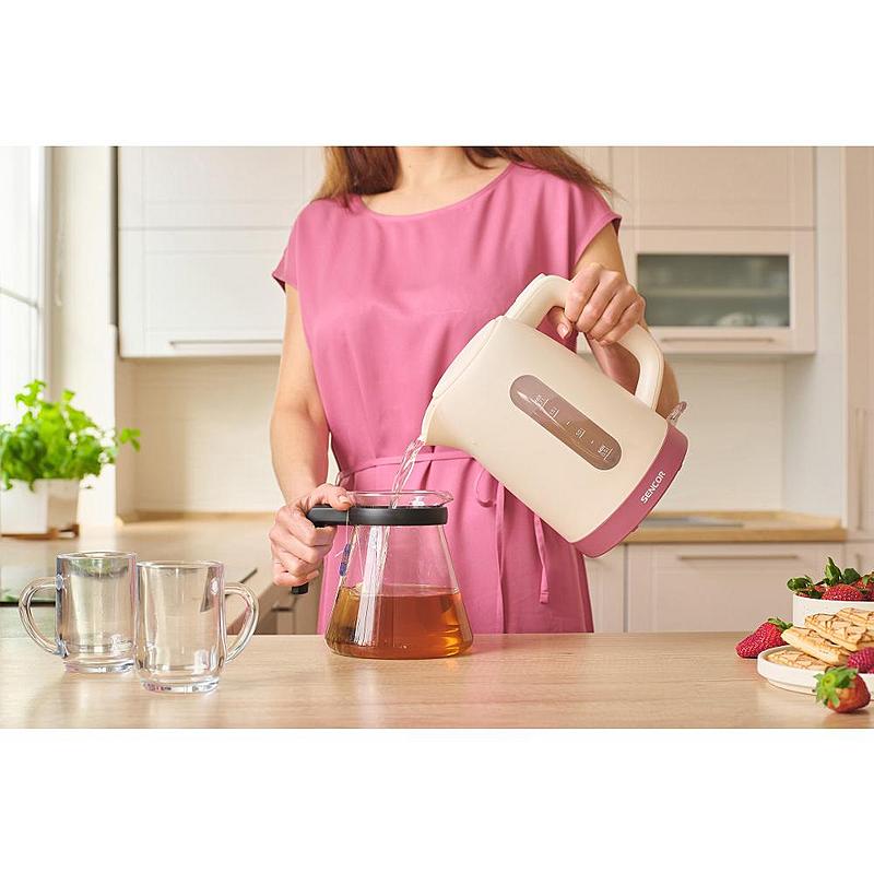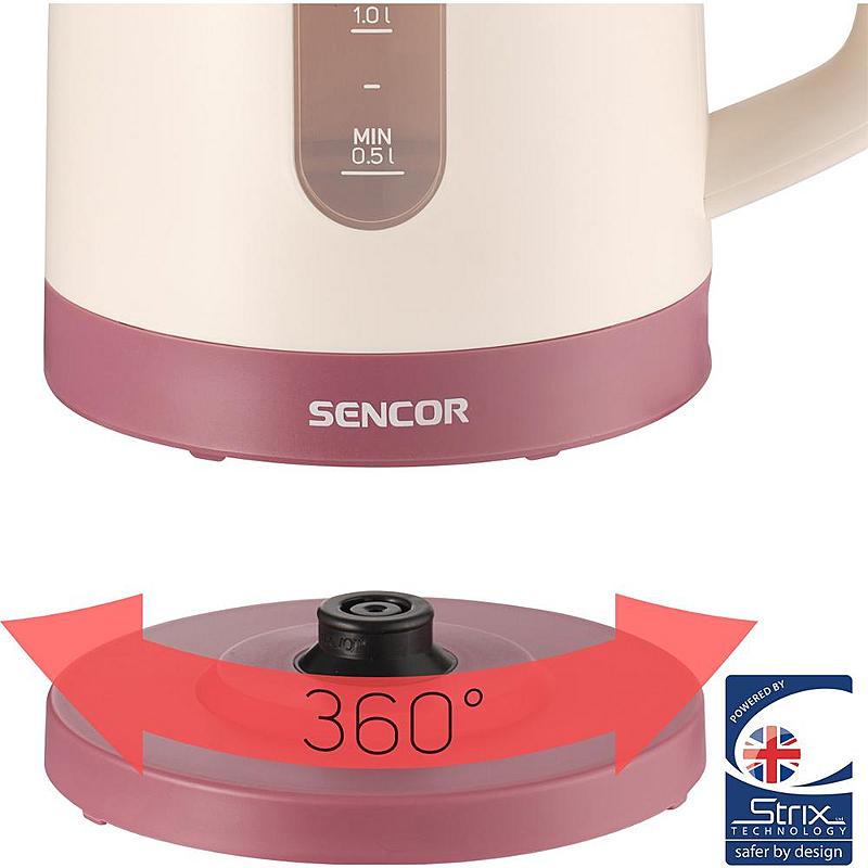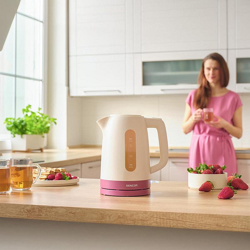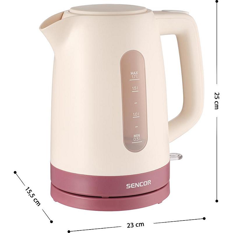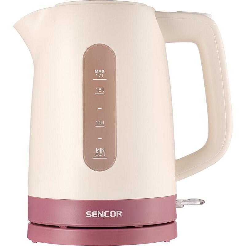 Rychlovarná konvice Sencor s objemem 1,7 l, vodoznakem a kontrolkou provozu.