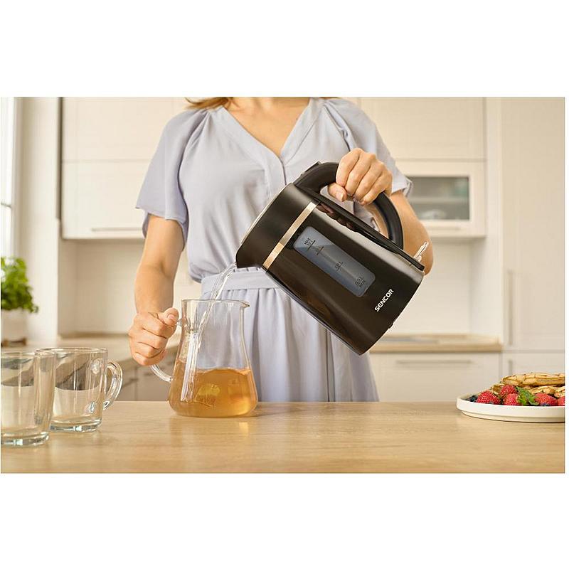 Rychlovarná konvice Sencor s vyjímatelným a omyvatelným filtrem, kontrolkou zapnutí a objemem 1,7 l.
