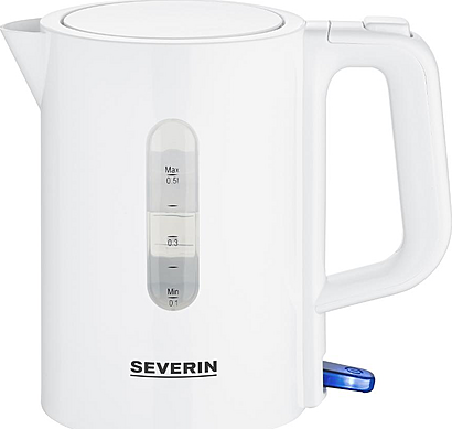 Cestovní konvice Severin s objemem 0,5 litru, přepínatelným napětí a vodoznakem.
