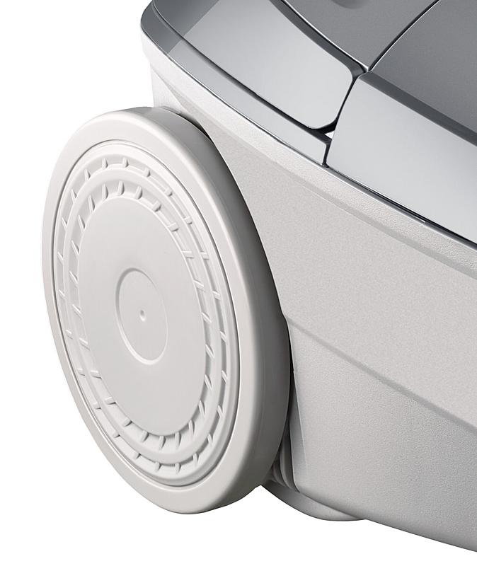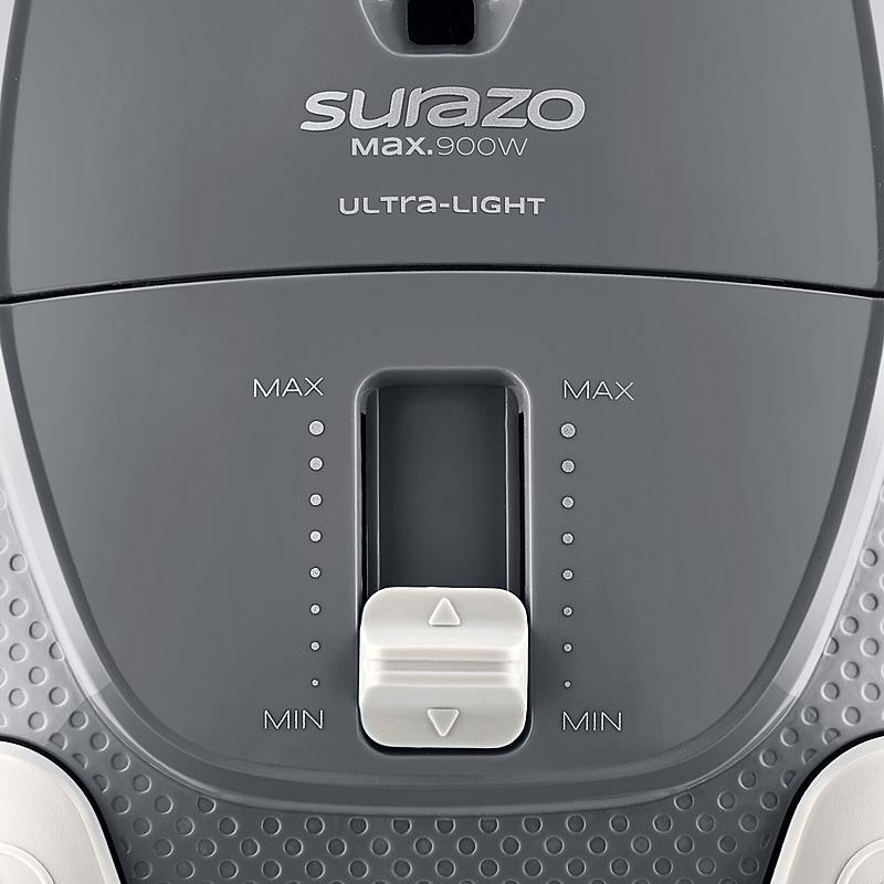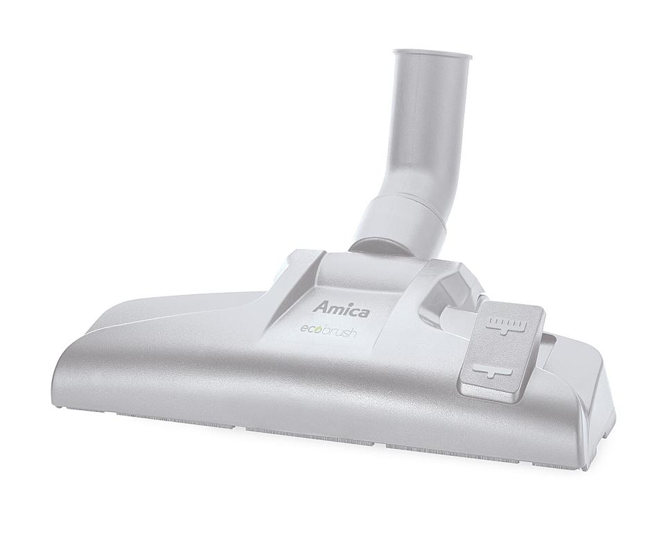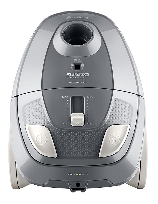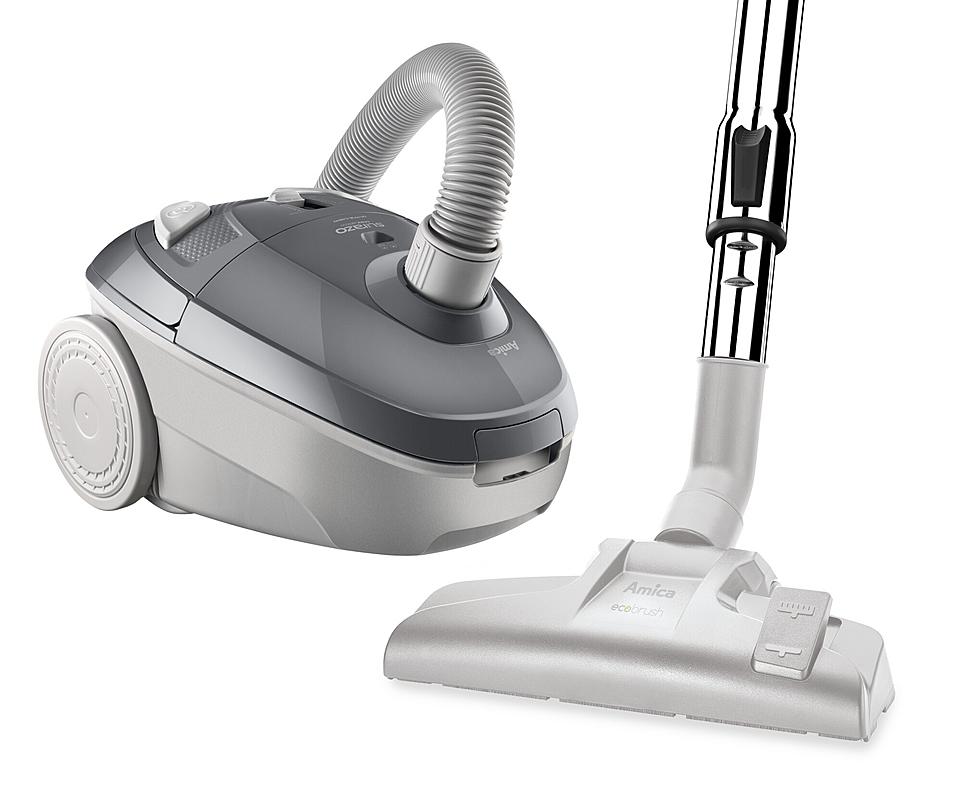 Sáčkový vysavač Amica s mechanickou regulací výkonu na vysavači i rukojeti, automatickým navíjením kabelu a indikátorem plného sáčku.
