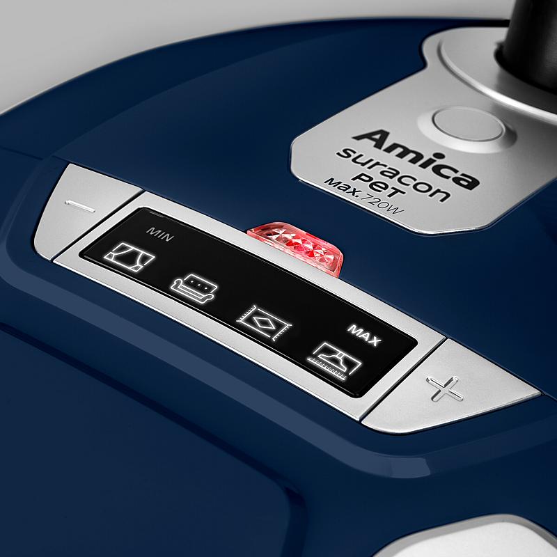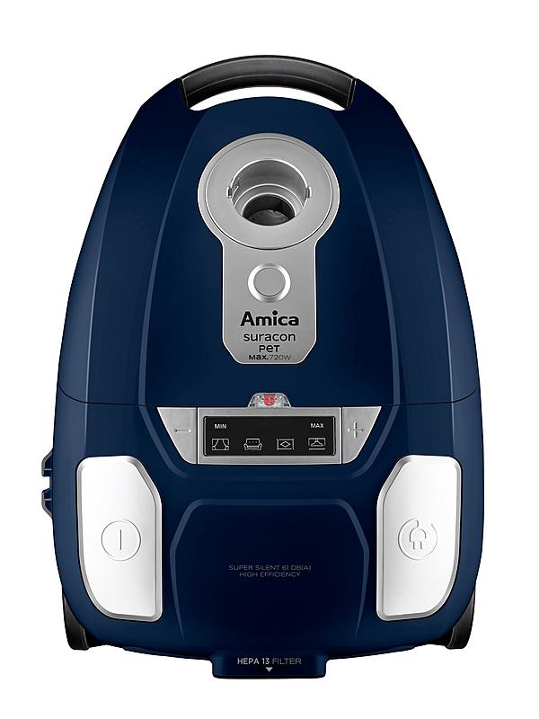Sáčkový vysavač Amica s elektronickou regulací sacího výkonu, turbokartáčem, PET hubicí a plynulým startem.