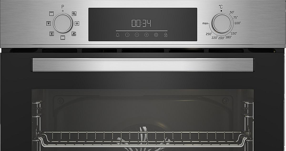 Vestavná trouba Beko s dotykovým displejem a funkcí parního čištění. Energetická třída A, 8 pečicích programů a celkový vnitřní objem 72 litrů.