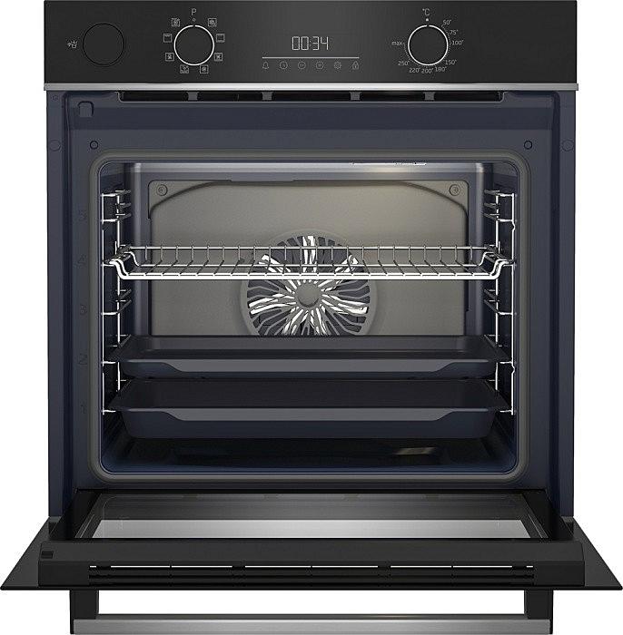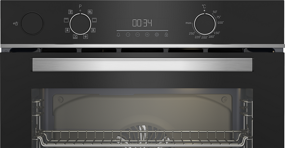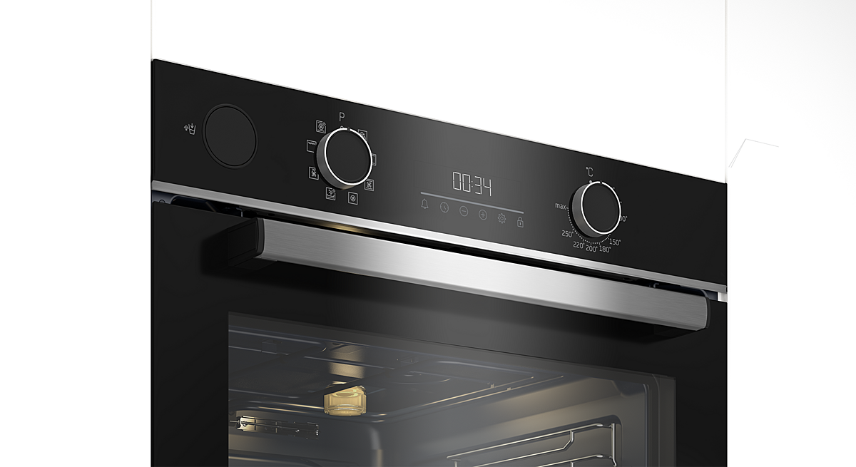 Vestavná trouba Beko s dotykovým displejem a funkcí parního čištění. Energetická třída A, 9 pečicích programů a celkový vnitřní objem 72 litrů.