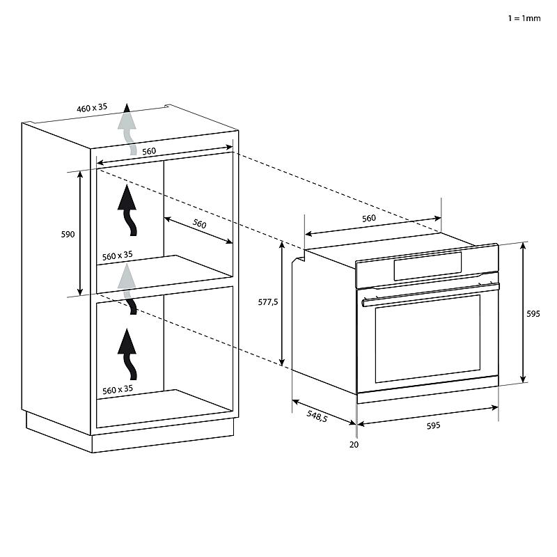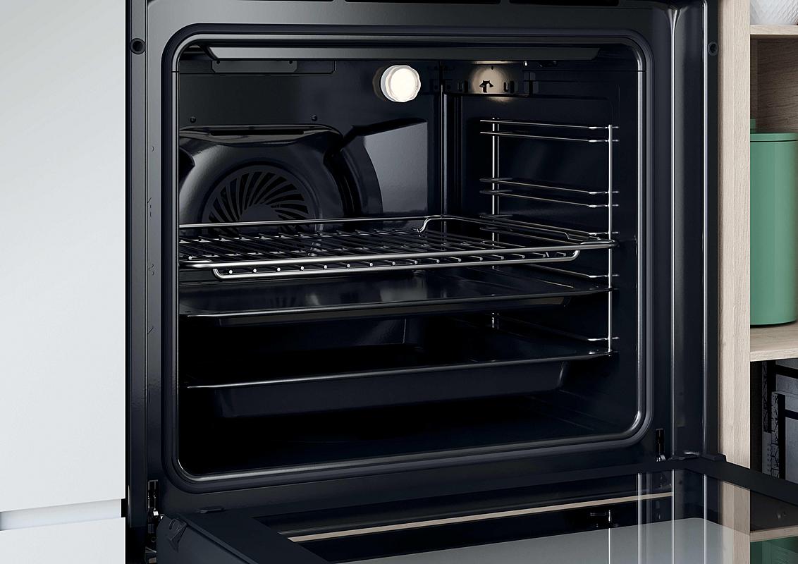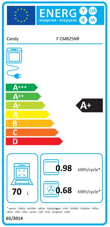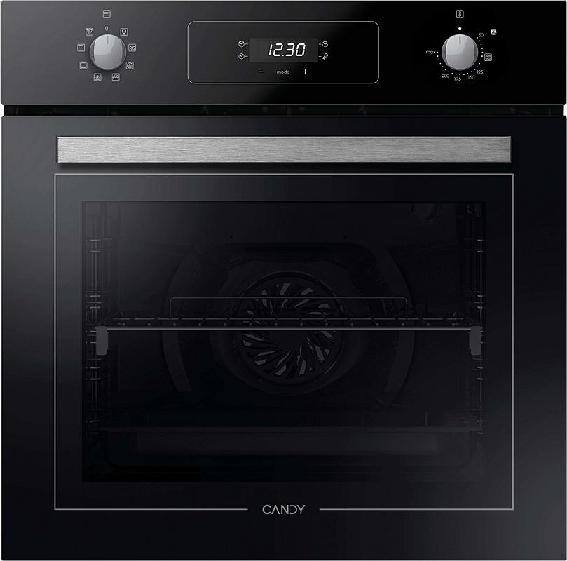 Multifunkční vestavná trouba Candy s minutkou, grilem a ventilátorem. Energetická třída A+, celkový objem 70 l a pomalé dovírání dvířek.