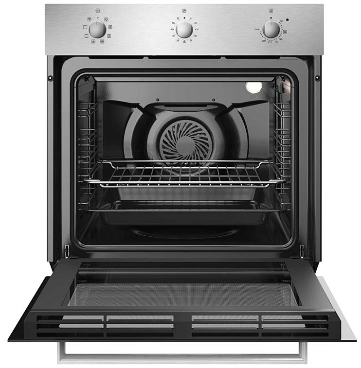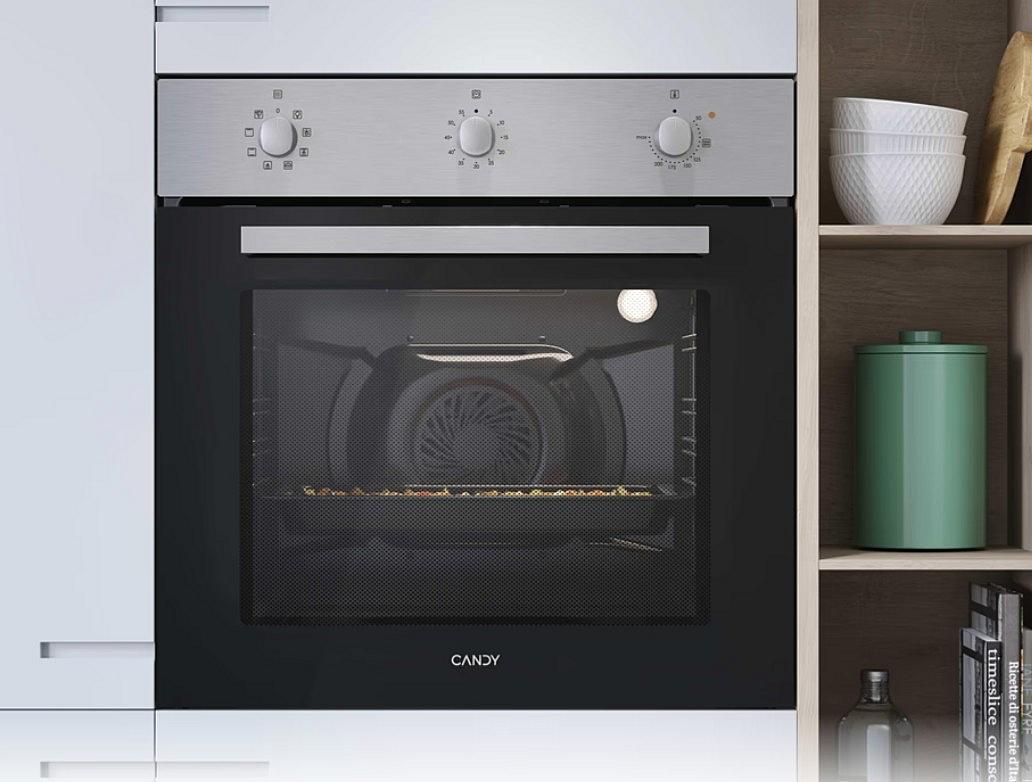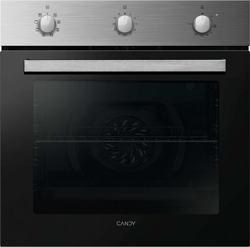 Vestavná trouba Candy s mechanickou minutkou a nerezovými drátěnými pojezdy. Energetická třída A+, 8 pečicích programů a celkový vnitřní objem 70 litrů.