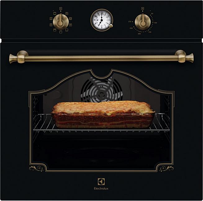 Vestavná trouba Electrolux s retro designem a topným kruhovým tělesem. Energetická třída A, 9 programů a celkový objem trouby 72 litrů.