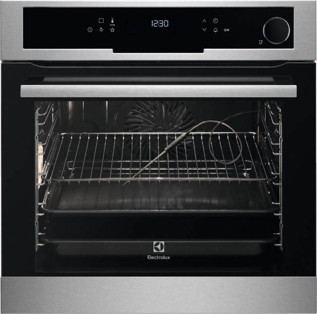 Vestavná trouba Electrolux s váhovými programy a teplotní sondou na maso. Energetická třída A+, funkce rychlého zahřátí a celkový objem trouby 71 litrů.
