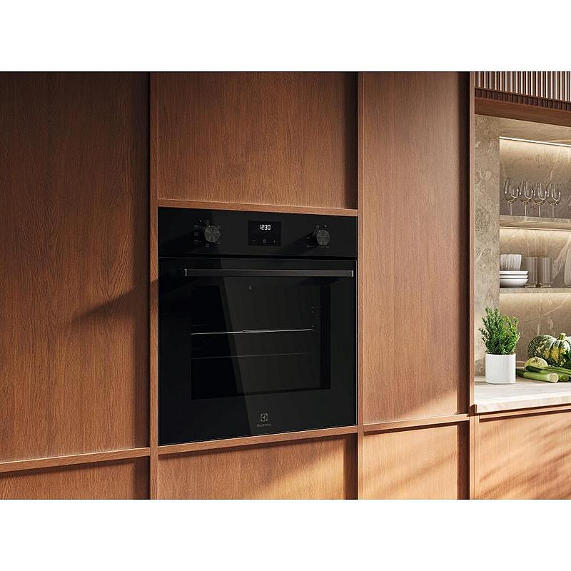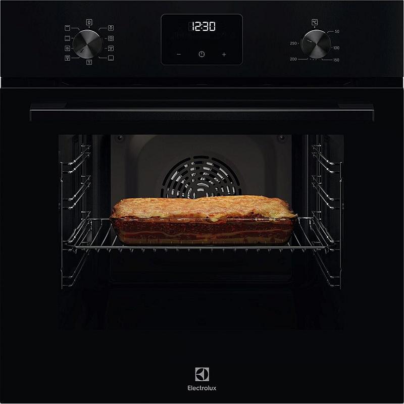 Multifunkční vestavná trouba Electrolux s kruhovým topným tělesem, grilem a katalytickým čištěním. Energetická třída A, možnost nastavení času vaření a minutka.
