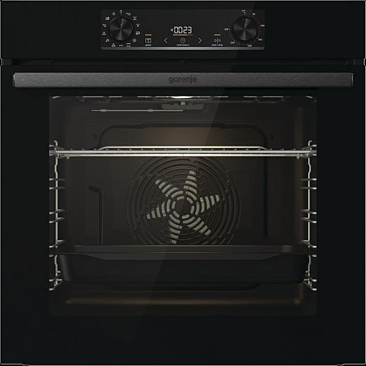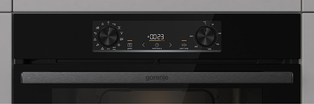 Vestavná trouba Gorenje s dotykovým displejem a zasouvacími knoflíky. Energetická třída A, 12 programů a příkon 3500 W.