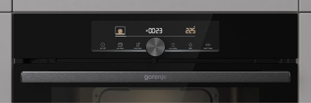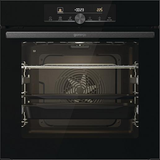 Multifunkční trouba Gorenje s tlumeným zavíráním dvířek a teleskopickým výsuvem. Energetická třída A+, 22 programů a celkový objem 77 litrů.